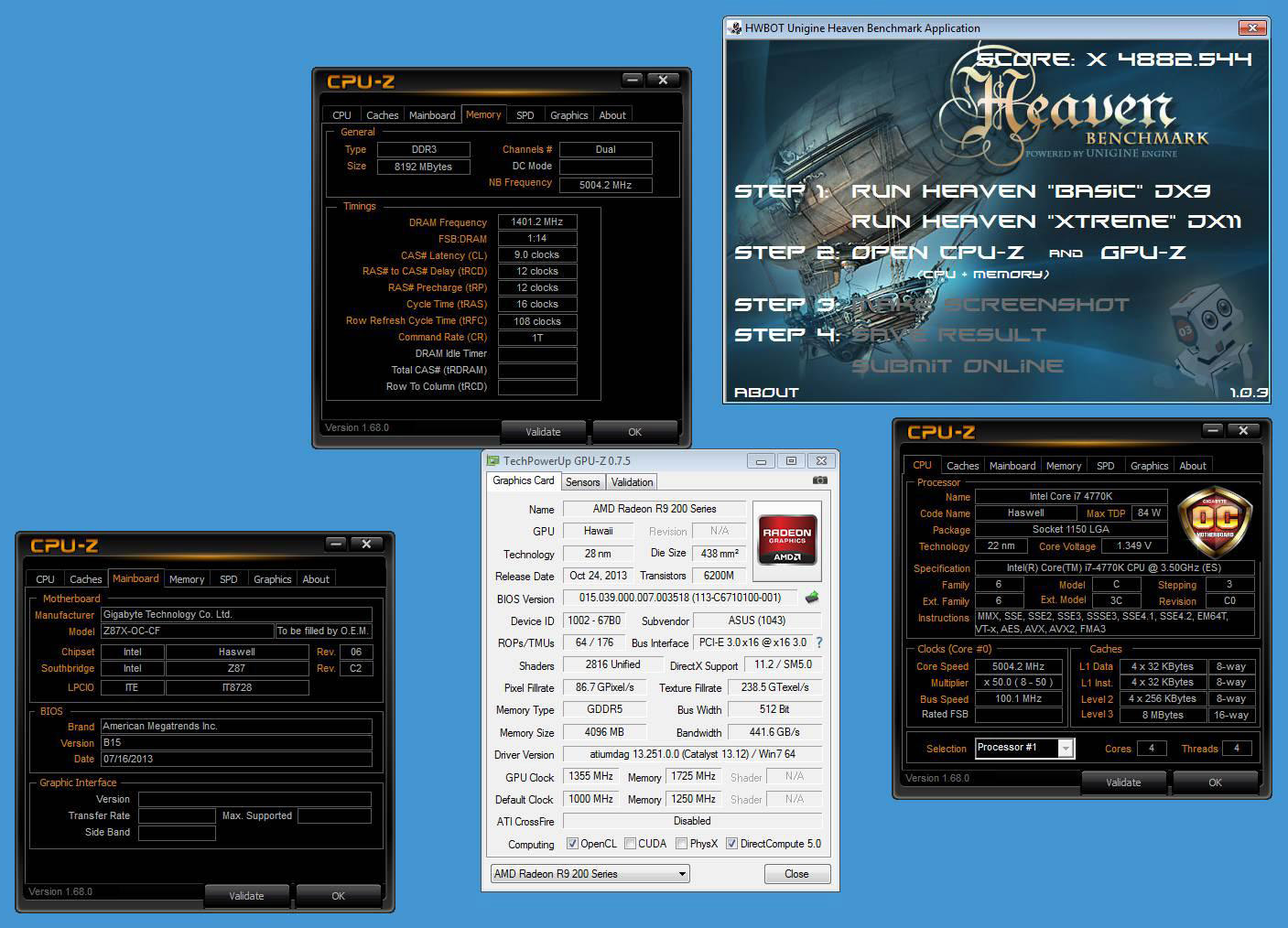 Как отметил сам Hicookie, для охлаждения GPU видеокарты Gigabyte Radeon R9 290X он использовал жидкий гелий, впрочем, достигнутый разгон (1355/6900 МГц) вполне по силам и «фреонке». Эксперименты проводились на плате Gigabyte Z87X-OC с подключенными к ней процессором Intel Core i7-4770K (@5004 МГц), двумя 4-гигабайтными модулями оперативной памяти G.Skill TridentX, функционировавшими в режиме DDR3-2802, твердотельным накопителем G.Skill Phoenix III и 1200-ваттным блоком питания Enermax.