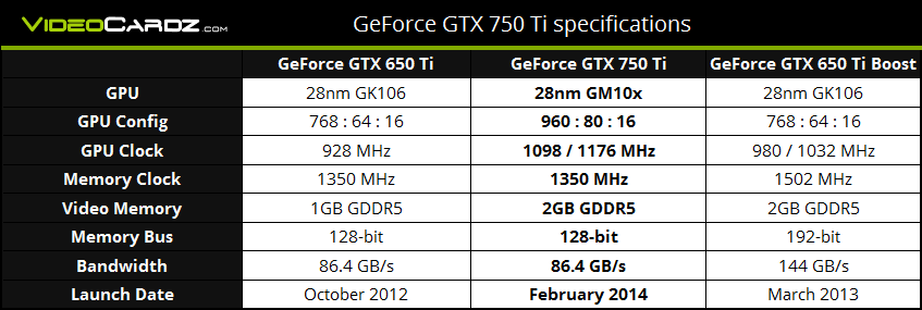 GeForce GTX 750 Ti получит 960 потоковых процессоров, 80 текстурных блоков (TMU) и 16 блоков рендеринга (ROP). Объем буферной памяти GDDR5 вырастет вдвое относительно GTX 650 Ti — до 2 ГБ. Шина памяти разрядностью 128 бит не позволит готовящейся новинке достичь уровня видеокарты GTX 650 Ti Boost, которая не только располагает 192-битной шиной, но и чипами GDDR5 с более высокой эффективной частотой (6008 МГц). Номинальные частоты GeForce GTX 750 Ti, судя по цифрам на скриншоте, составляют 1098(1176)/5400 МГц (ядро/память).