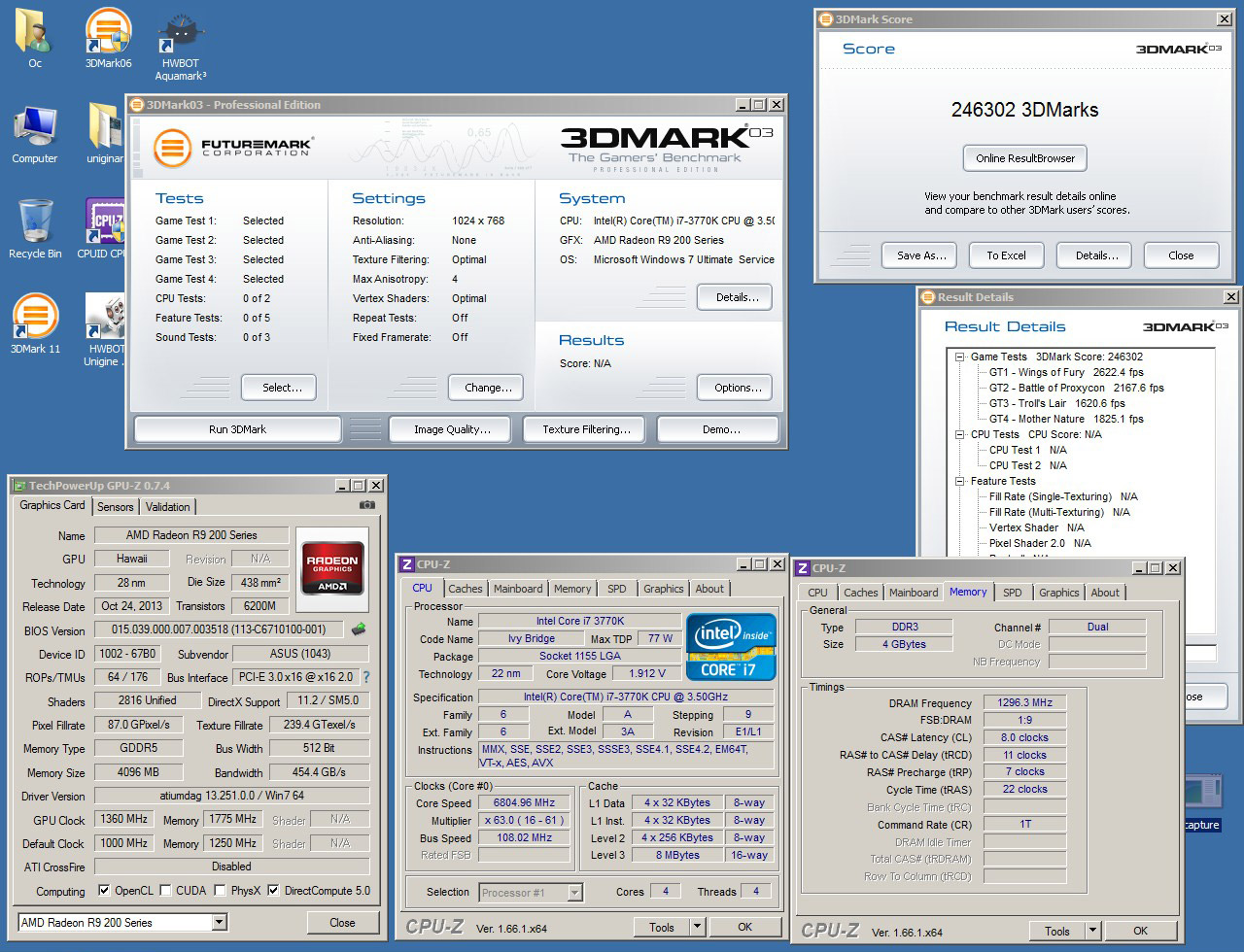 Старый бенчмарк 3DMark03 традиционно благоволит к видеокартам Nvidia GeForce, однако и он не смог устоять перед мощью Radeon R9 290X. Модель Hawaii оказалась настолько удачной для этого теста 11-летней давности, что ее разгон оверклокером sofos1990 всего лишь до 1360/7100 МГц привел к мировому рекорду — 246302 очка. Разумеется, в «древних» графических бенчмарках сегодня не обойтись без удачного экземпляра процессора Intel Core. Таковым для sofos1990 стал четырехъядерный Core i7-3770K на частоте 6804 МГц. И CPU, и GPU охлаждались при помощи жидкого азота.