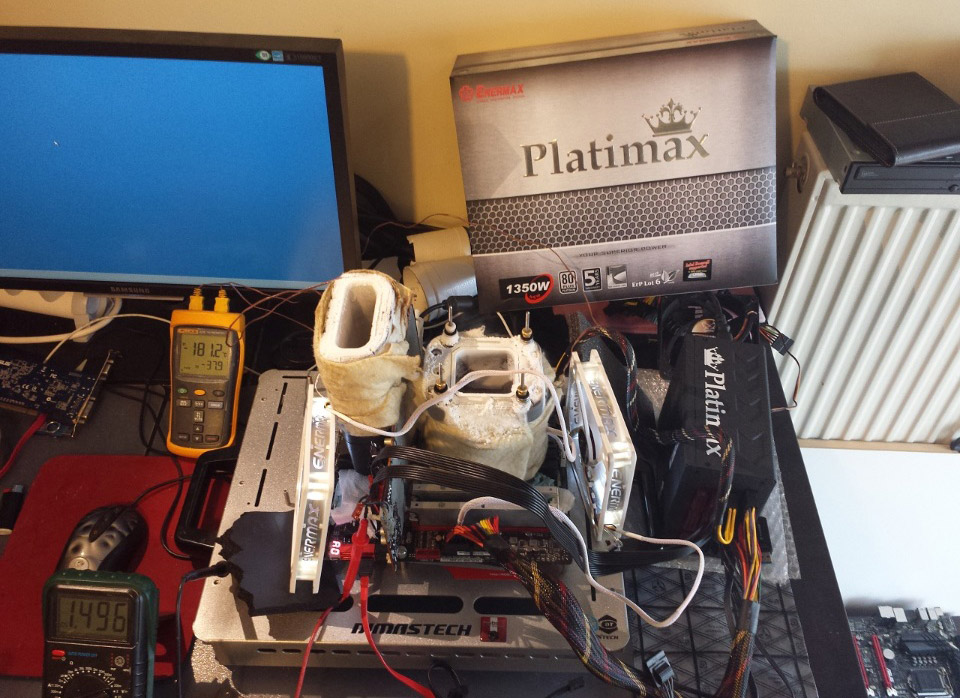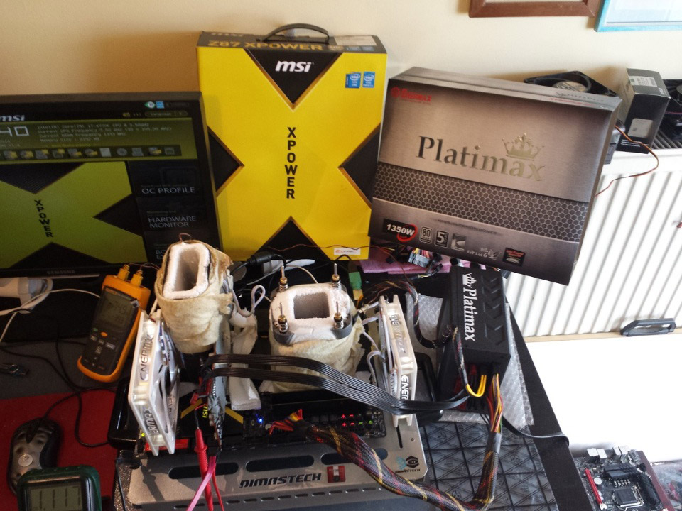 Для тестов греческий мастер экстремального разгона использовал референсную видеокарту MSI R9 290X с прошивкой VGA-BIOS от Asus, материнскую плату Asus Maximus V Gene (Z77), 4 ГБ (2 x 2 ГБ) оперативной памяти типа DDR3, работавшей на эффективной частоте 2592,6 МГц с таймингами 8-11-7-22 (CAS-tRCD-tRP-tRAS), твердотельный накопитель Plextor M5 Pro Extreme и блок питания Enermax Platimax 1350W.