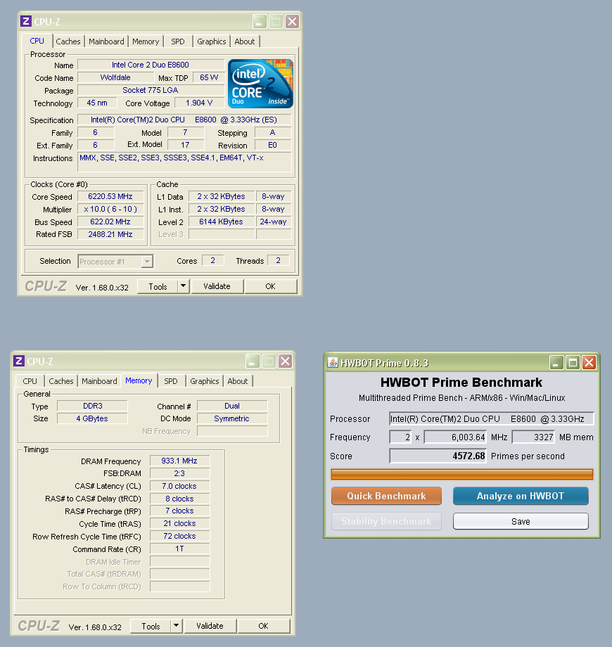 Разгон «старика» Wolfdale (45-нм) до 6220 МГц на материнской плате с чипсетом Intel X48 производился методом повышения частоты шины FSB с 333 до 622 МГц. Память DDR3 работала на эффективной частоте 1866 МГц с таймингами 7-8-7-21.