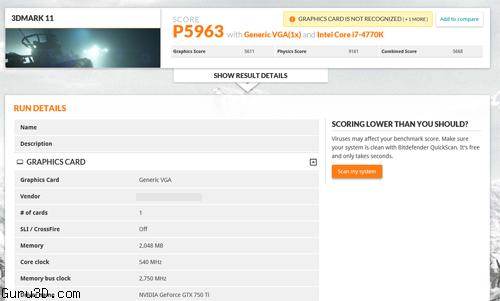Тестовая система, в составе которой испытывались новые решения на базе Nvidia GM107, также включала четырехъядерный процессор Intel Core i7-4770K, 8 ГБ оперативной памяти Corsair XMS3 DDR3 и материнскую плату Asus Z87-K. Старшему GeForce GTX 750 Ti удалось показать результат в 5963 очка 3DMark 11 (Performance), а более скромный GeForce GTX 750 набрал 5250 пунктов.