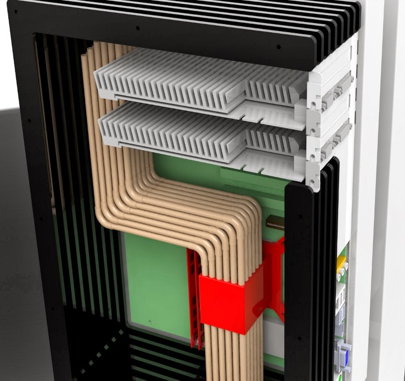 На эскизах видно, что тепловые трубки не пронизывают ребра радиатора и, возможно, даже не соприкасаются. Тепло рассеивается только за счет перемещения жидкости от одного конца трубки к другому (например, посредством силы тяжести, когда конденсат стекает обратно в зону испарения).