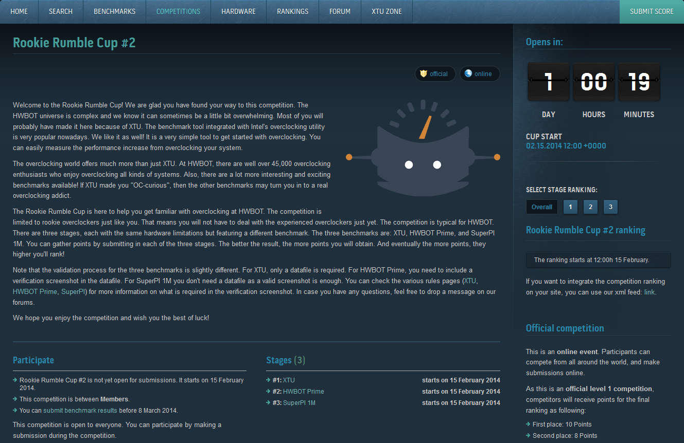 Завтра, 15 февраля в 14:00 по киевскому времени на оверклокерском портале HWBot.org стартует второй турнир для новичков соревновательного бенчмаркинга — Rookie Rumble Cup 2. Как и в прошлый раз, энтузиастам разгона предстоит выяснить сильнейшего по итогам трех дисциплин — Intel XTU, HWBot Prime и SuperPi 1M. Правила и установочные файлы данных тестов находятся в разделе процессорных бенчмарков на hwbot.org.