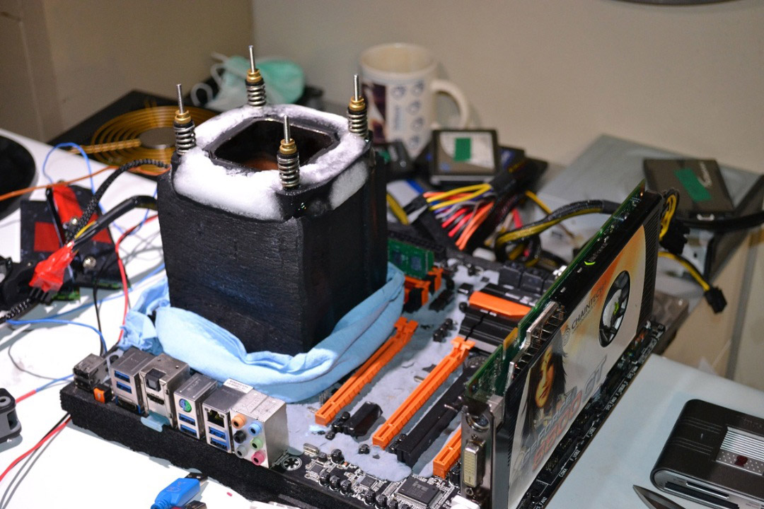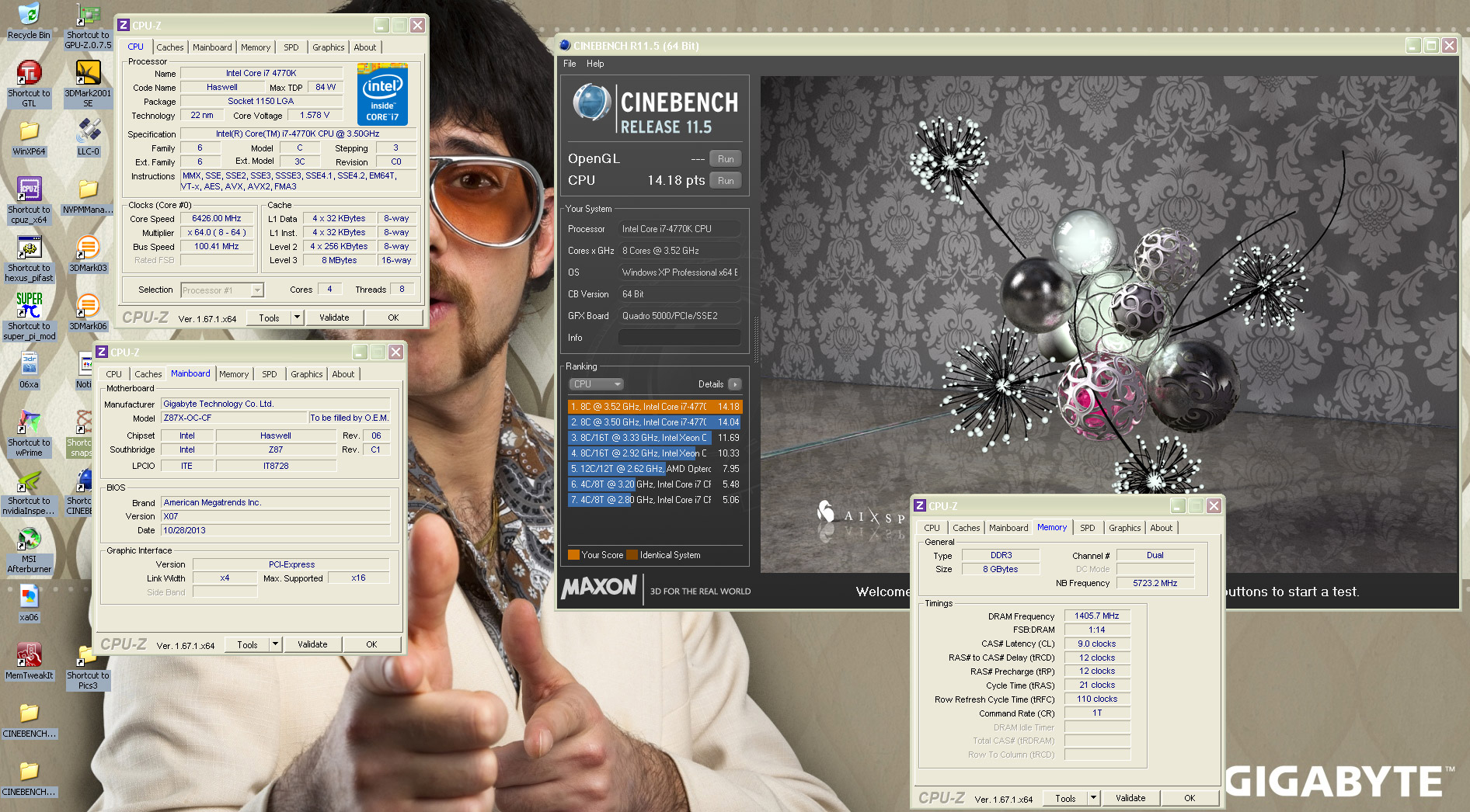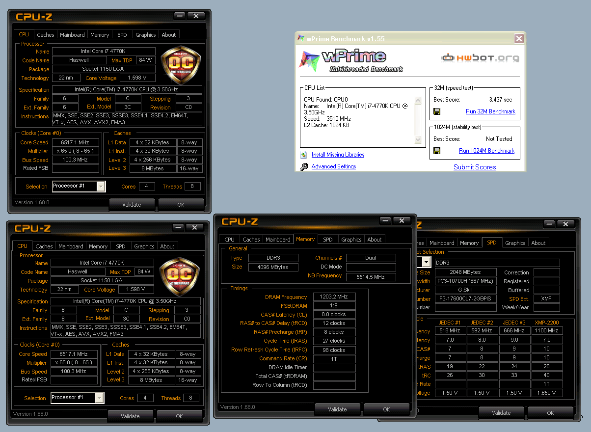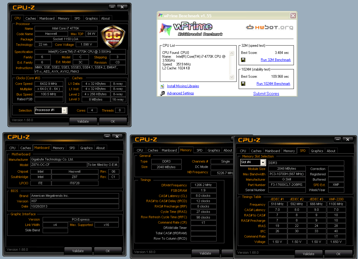 Разгон отборного экземпляра процессора Intel Core i7-4770K в вышеупомянутых бенчмарках составил от 6426 до 6517 МГц (партия L310B491). Помимо него в системе были задействованы: материнская плата Gigabyte GA-Z87X-OC, оперативная память G.Skill Pi DDR3 с эффективной частотой до 2811 МГц, блок питания Cooler Master Silent Pro Gold мощностью 1200 Вт и испаритель для жидкого азота.