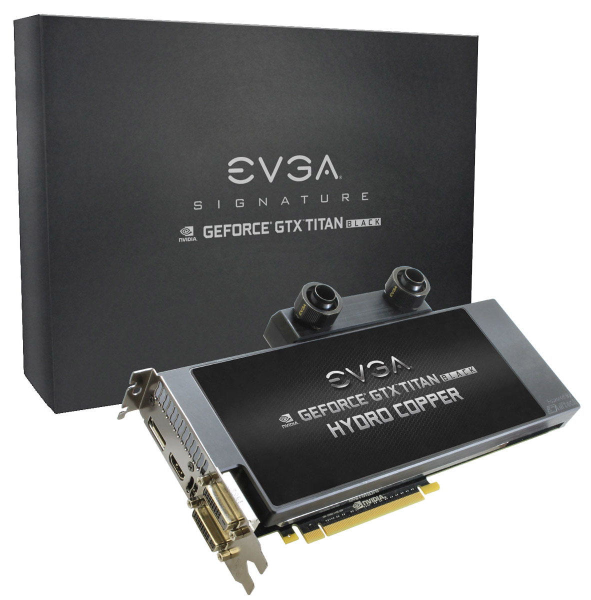 Ускорители EVGA GTX Titan Black Hydro Copper нуждаются в подключении 6- и 8-контактного кабелей дополнительного питания, шлангов СВО, а также интерфейсного кабеля к разъему DVI-I, DVI-D, HDMI или DisplayPort.