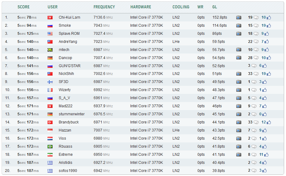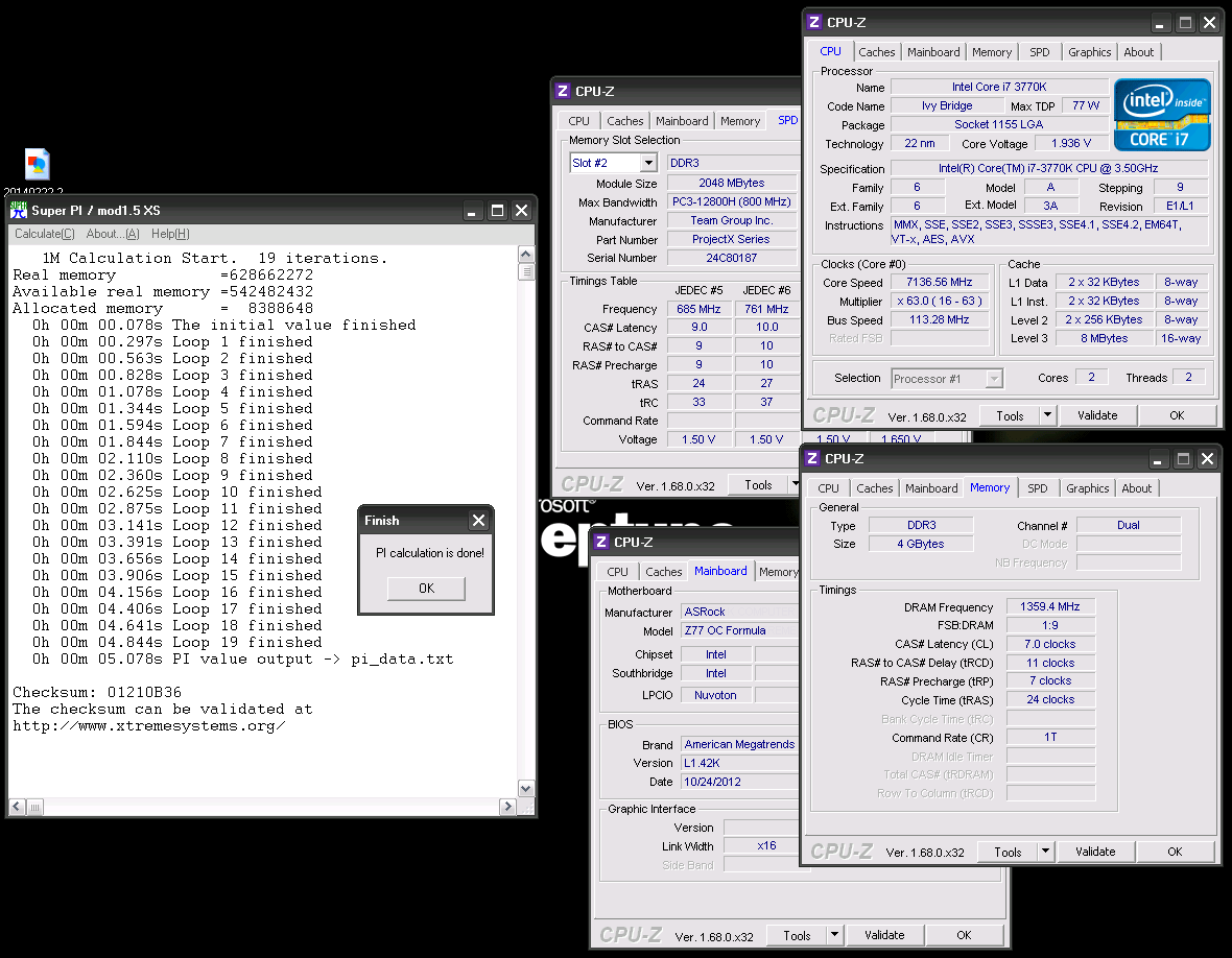 Экспериментальный стенд включал материнскую плату ASRock Z77 OC Formula, разогнанный до 7136 МГц четырехъядерный процессор Intel Core i7-3770K, два 2-гигабайтных модуля оперативной памяти Team Group ProjectX с эффективной частотой 2719 МГц и таймингами 7-11-7-24, блок питания Antec HCP-1200, твердотельный накопитель OCZ Vector 256 ГБ и видеокарту GeForce 6200. Бенч-сессия проводилась в среде ОС Windows XP.