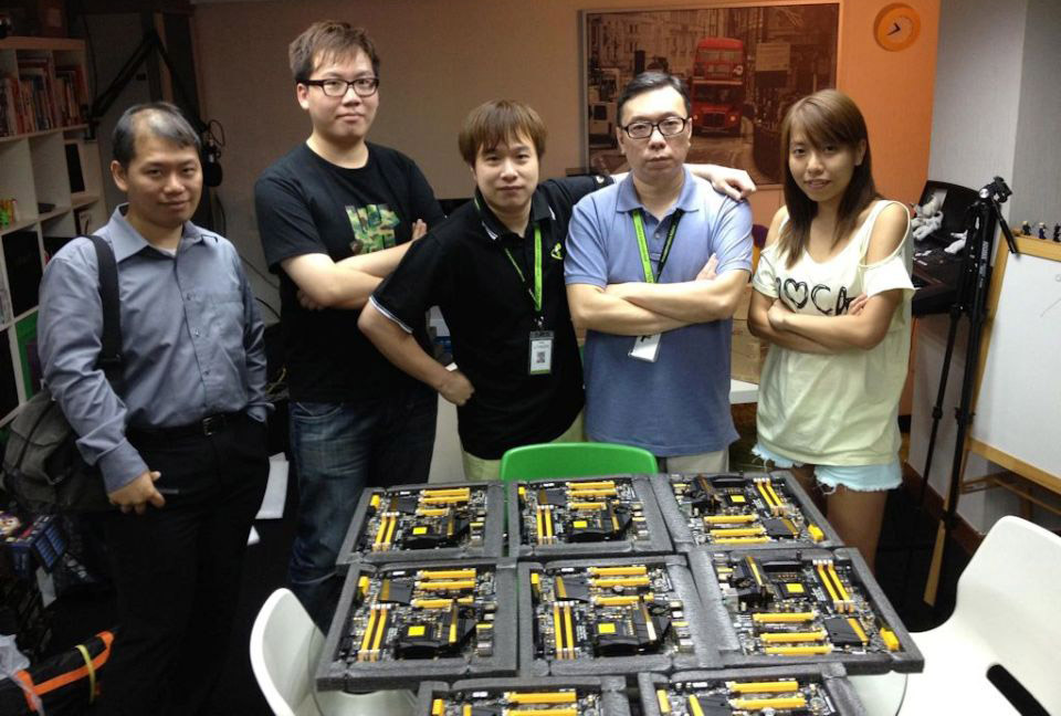 Рекордному прогону теста SuperPi 1M предшествовал кропотливый подбор комплектующих и микросхем оперативной памяти. Над проектом трудились как минимум пять оверклокеров, в том числе коллега Chi-Kui Lam, известный как Mad222 (на фото стоит рядом с девушкой CherV, в центре — Lam).