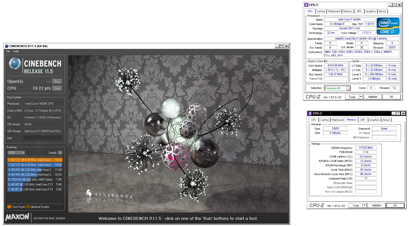 Оверклокеры, бьющиеся за лидерство в процессорном бенчмарке Cinebench R11.5, понемногу подбираются к отметке в 20 очков, хотя вряд ли кому-либо удастся преодолеть ее, используя нынешний модельный ряд настольных CPU Intel. Примечательно, что в арсенале соперников — американца Gunslinger и француза Wizerty — значатся разные процессоры одной линейки — Core i7- Core i7-4960X и Core i7-4930K соответственно.
