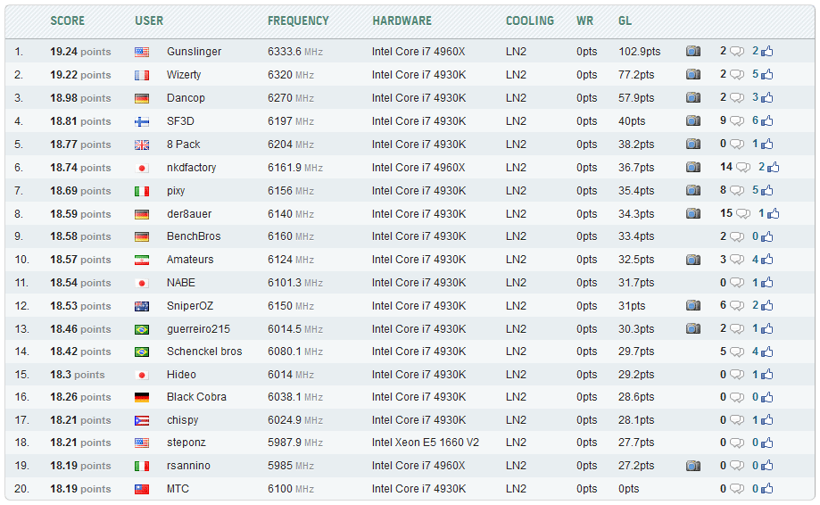 Топовая модель 4960X, обладающая большим объемом кэш-памяти третьего уровня, пока не может убедительно доказать свое превосходство над младшим шестиядерником: разрыв составляет всего лишь 0,02 очка, причем Gunslinger разогнал свой CPU до 6333 МГц, а Wizerty выжал из Core i7-4930K только 6320 МГц.