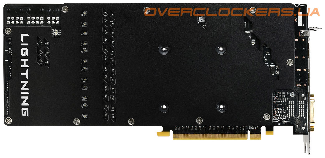 В числе достоинств нового представителя семейства MSI Lightning — использование электрических узлов военного класса, твердотельных конденсаторов с длительным сроком службы, транзисторов в металлическом корпусе и задней усилительной пластины (бэкплейта). На плате распаяны 12 фаз питания GPU (всего 16 или 17), гнезда для измерения напряжений и три силовых разъема PCI-E Power — один 6-контактный и два 8-контактных. Конфигурация видеовыходов, скорее всего, не отличается от таковой у референсных моделей: два DVI, единичные HDMI и DisplayPort.