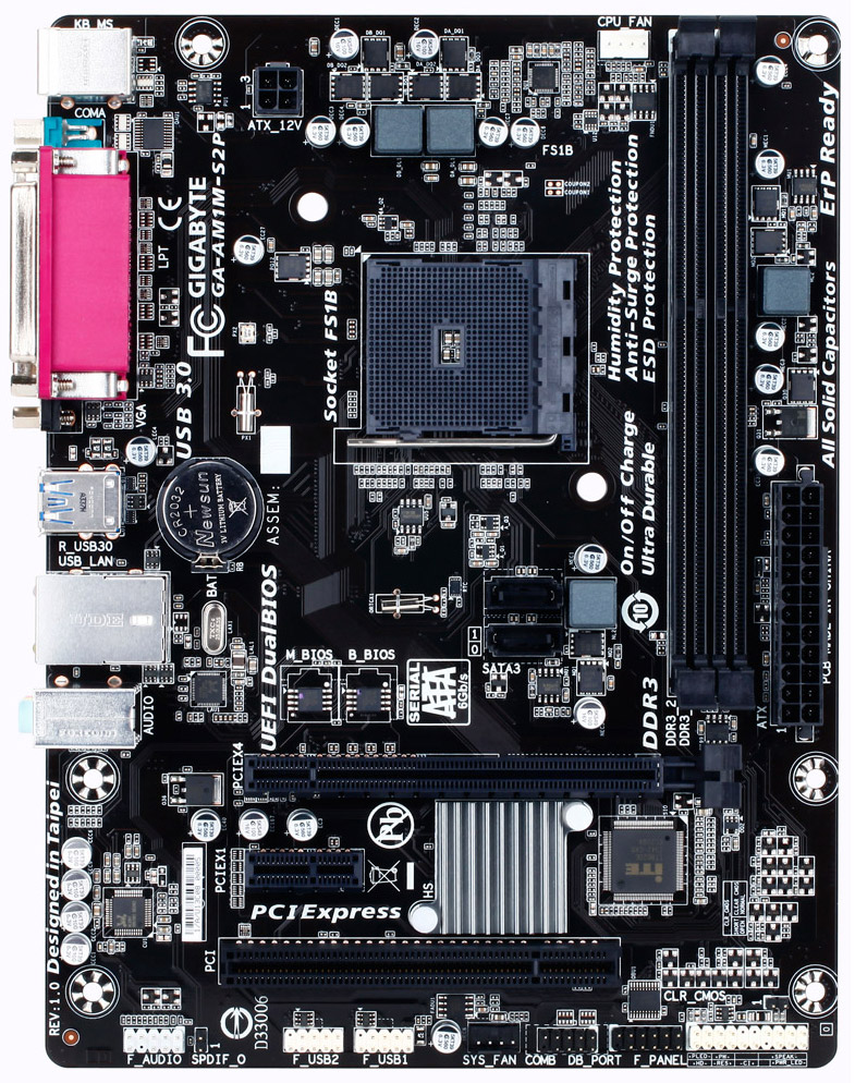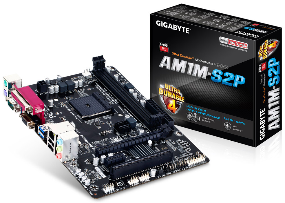 Новинки от Gigabyte Technology — GA-AM1M-S2P и GA-AM1M-S2H — выполнены в форм-факторе microATX (226 x 170 мм). Их объединяет наличие сокета AMD AM1, двух слотов для оперативной памяти DDR3-1333/1600, разъемов PCI Express 2.0 x16@x4 и PCI-E 2.0 x1, двух портов SATA 6 Гбит/с, разъемов питания ATX и ATX12V. Кроме того, на платах AM1M-S2P и AM1M-S2H размещены: два порта USB 3.0, гигабитный сетевой контроллер Realtek, аудиокодек Realtek ALC887 и два 4-контактных разъема для подключения вентиляторов.