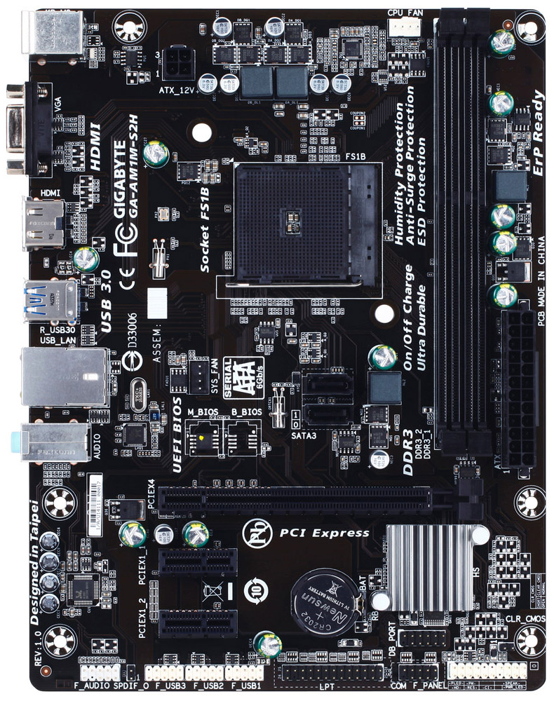 Плата Gigabyte GA-AM1M-S2H выделяется наличием электролитических конденсаторов и видеовыхода HDMI 1.4a (максимальное разрешение — 4096 x 2160). Теплосъемник, находящийся рядом с батарейкой UEFI, установлен на чипе ITE I/O.