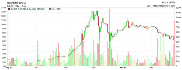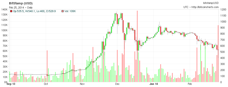 Согласно bitcoincharts.com, текущий курс криптовалюты Bitcoin составляет около $550 за единицу, что вдвое меньше показателя начала декабря 2013 г.