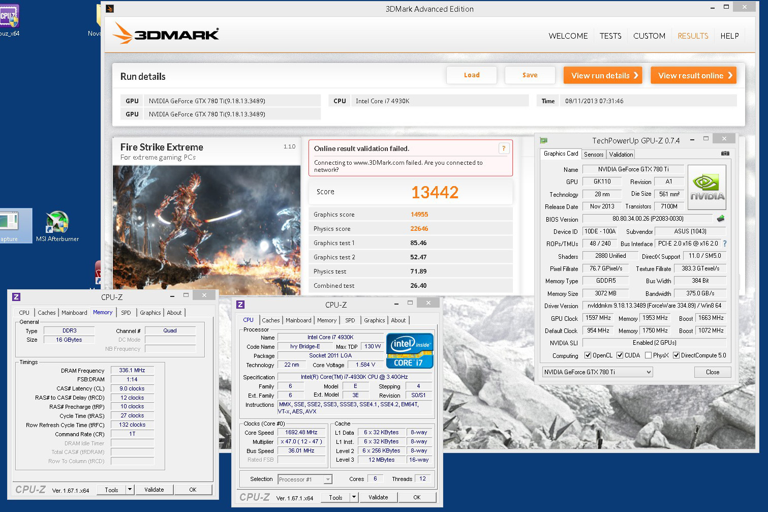 Rbuass смог разогнать тандем адаптеров Asus GeForce GTX 780 Ti DirectCU II до внушительных 1706/7812 МГц (GPU/память), частота шестиядерного процессора Intel Core i7-4930K составила 6068 МГц, 16 ГБ (4 x 4 ГБ) оперативной памяти работали в режиме DDR3-2415 с таймингами 9-12-11-27. Для охлаждения CPU и видеокарт, очевидно, потребовался жидкий азот.