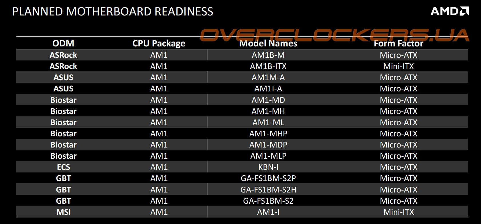 Большинство материнских плат AM1 будут выполнены в форм-факторе microATX и поступят в продажу по ценам от 30 до 50 долларов (наша оценка). Примерно в такую же сумму, быть может, чуть дороже обойдутся покупателям и процессоры AM1.