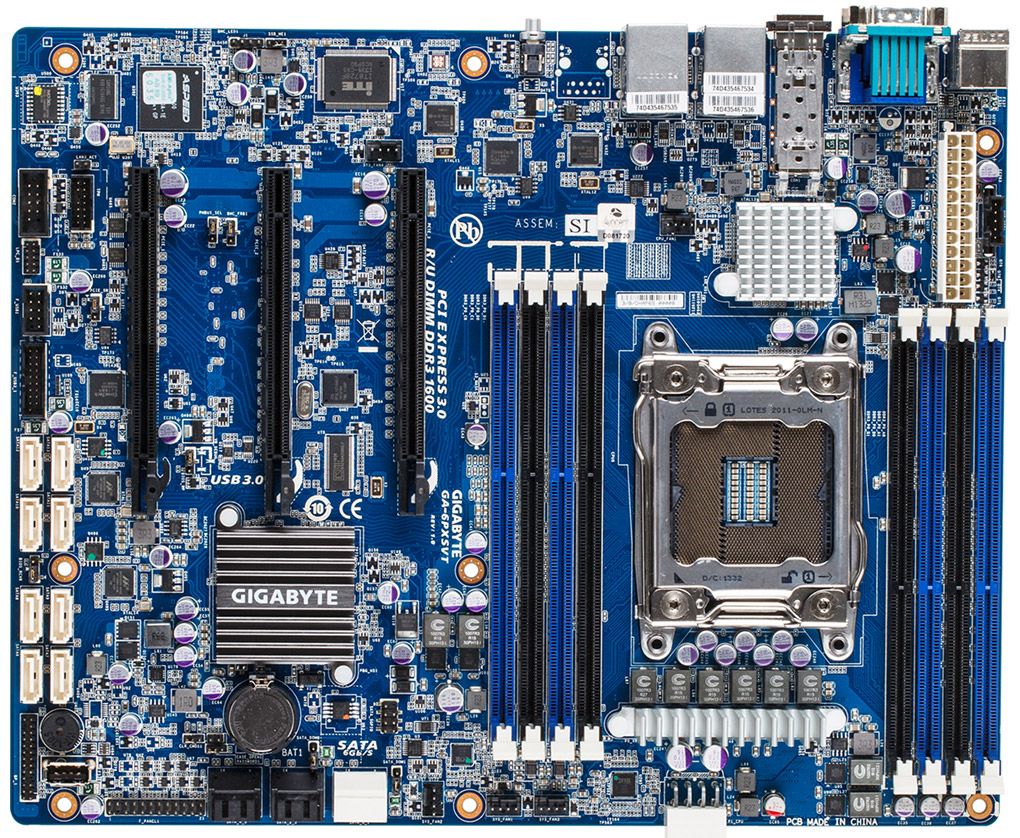 Продукт Gigabyte GA-6PXSVT обладает шестью фазами питания процессорного гнезда. Заявлена совместимость с CPU Xeon E5-1600/2600 (Sandy Bridge-EP), E5-1600/2600 v2 (Ivy Bridge-EP) и их настольными аналогами серии Core i7. Рекомендованные габариты кулера — 70 x 106 мм.