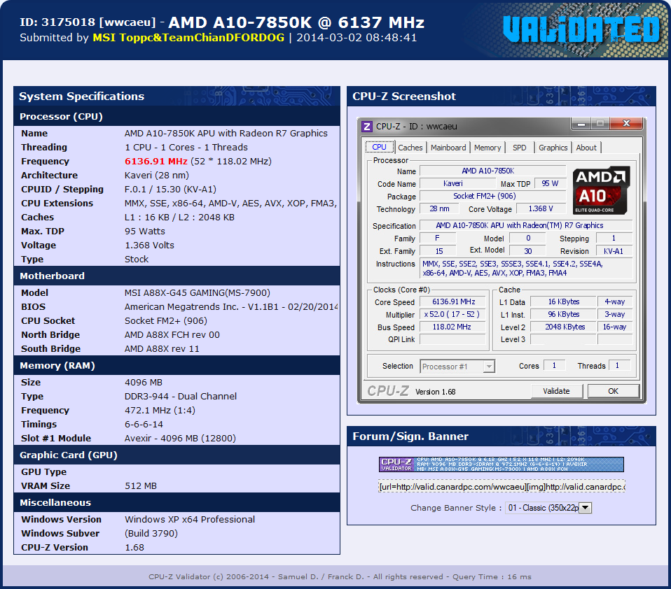 Максимальная частота топового APU Kaveri составила 6136,91 МГц. Опорная частота повышалась со 100 до 118 МГц, множитель — с 37x до 52x. Испытание A10-7850K на прочность проводилось на плате MSI A88X-G45 Gaming. Стенд также включал оперативную память Avexir Core DDR3, блок питания Antec High Current Pro 1200W, видеокарту GeForce 9800 GTX(+) и испаритель для жидкого азота.
