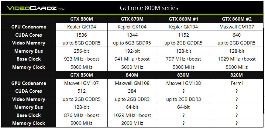 Старшая карта GeForce GTX 880M представляет собой всего лишь разогнанный вариант GTX 780M: частота ядра выросла с 771—797 МГц до 933+ МГц, память по-прежнему тактуется на эффективной частоте 5000 МГц. Новинка оперирует 1536 потоковыми процессорами, 256-битной шиной памяти и максимум 8 ГБ ОЗУ типа GDDR5.