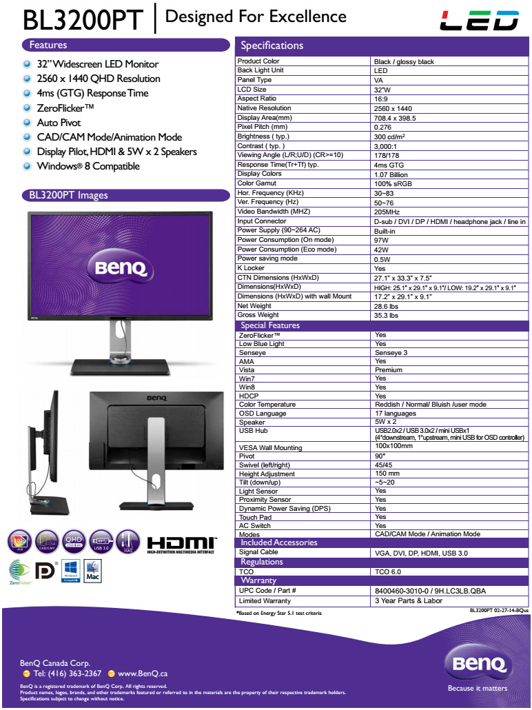 В рабочем режиме монитор BL3200PT потребляет от 42 до 97 Вт электропитания. Эргономичная подставка позволяет наклонять экран, регулировать его высоту в пределах 0—150 мм, поворачивать экран в горизонтальной и вертикальной плоскостях. Интернет-издание Hardware.info полагает, что рекомендованная цена новинки для западноевропейского рынка составит около €800.
