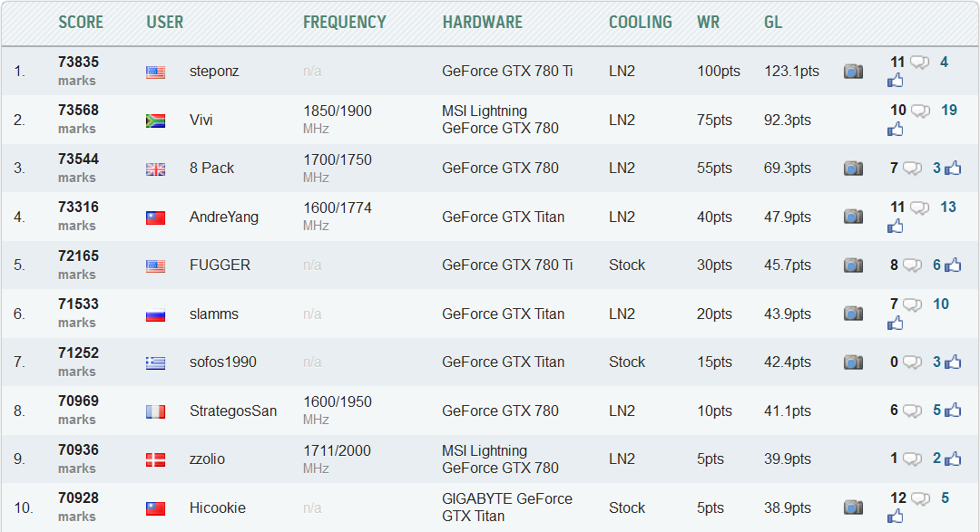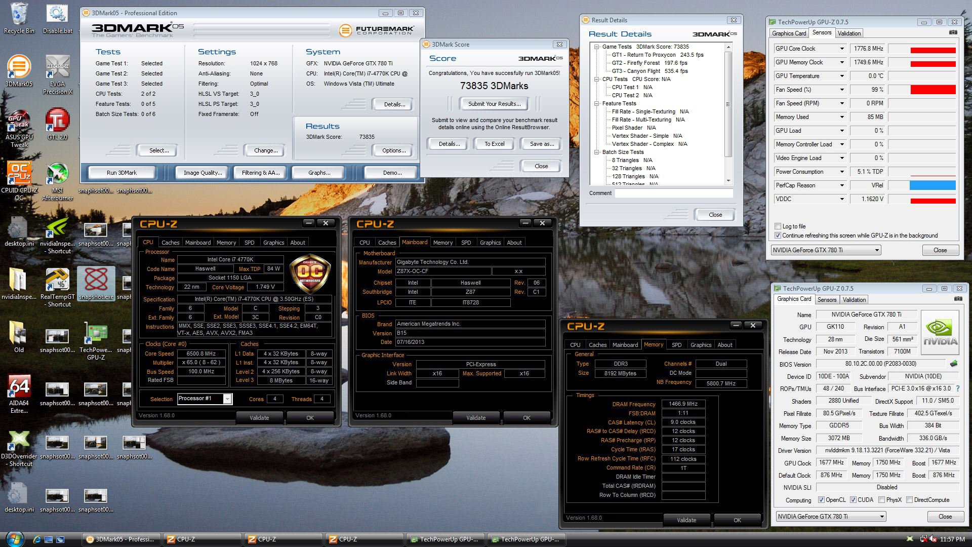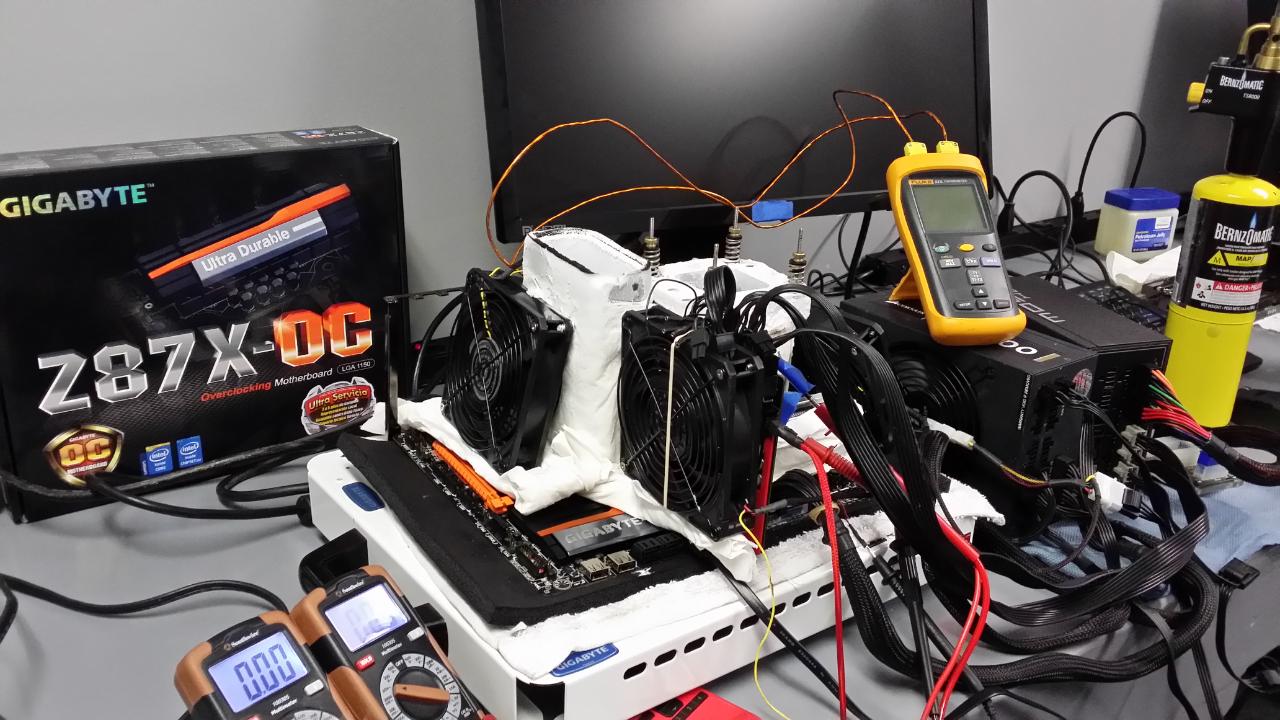 Для «золота» в 3DMark05 мастер разгона из США использовал охлажденные жидким азотом видеокарту GeForce GTX 780 Ti (с разгоном ядра до 1776 МГц и частотой памяти 7000 МГц) и процессор Intel Core i7-4770K (3,5@6,5 ГГц). Немалую роль в общем успехе сыграло применение материнской платы Gigabyte GA-Z87X-OC (на чипсете Intel Z87) и двух блоков питания, один из которых был подключен только к видеоадаптеру.