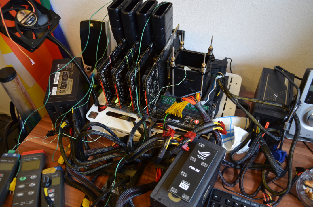 Ниже приведено фото стенда с четырьмя видеокартами EVGA GTX 780 Ti Classified KPE: