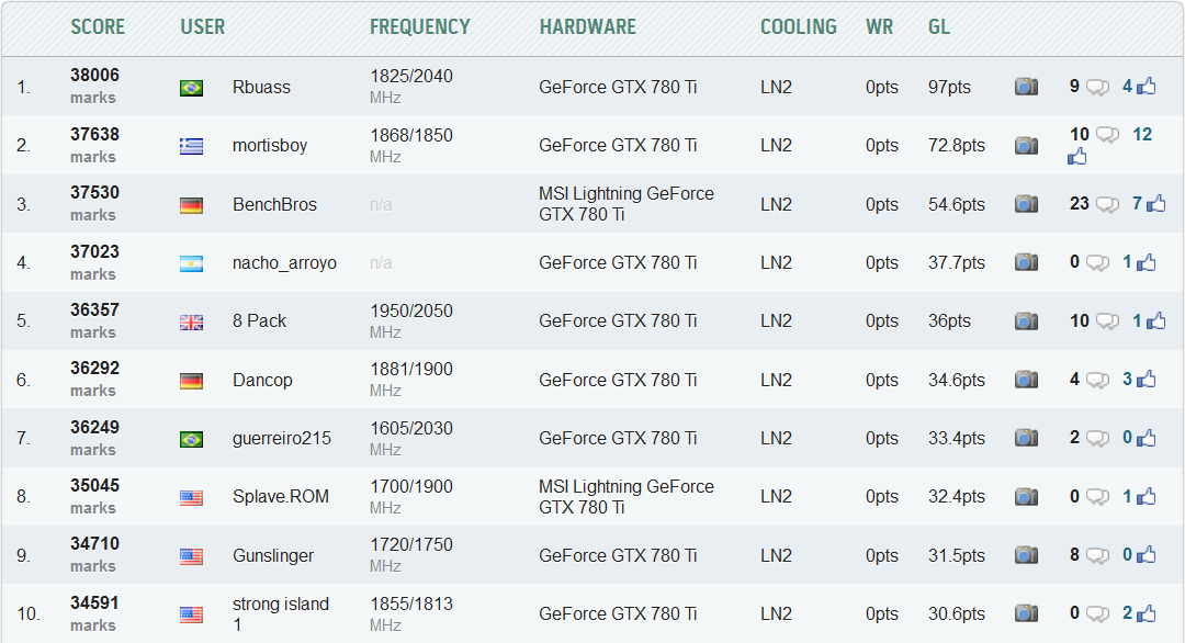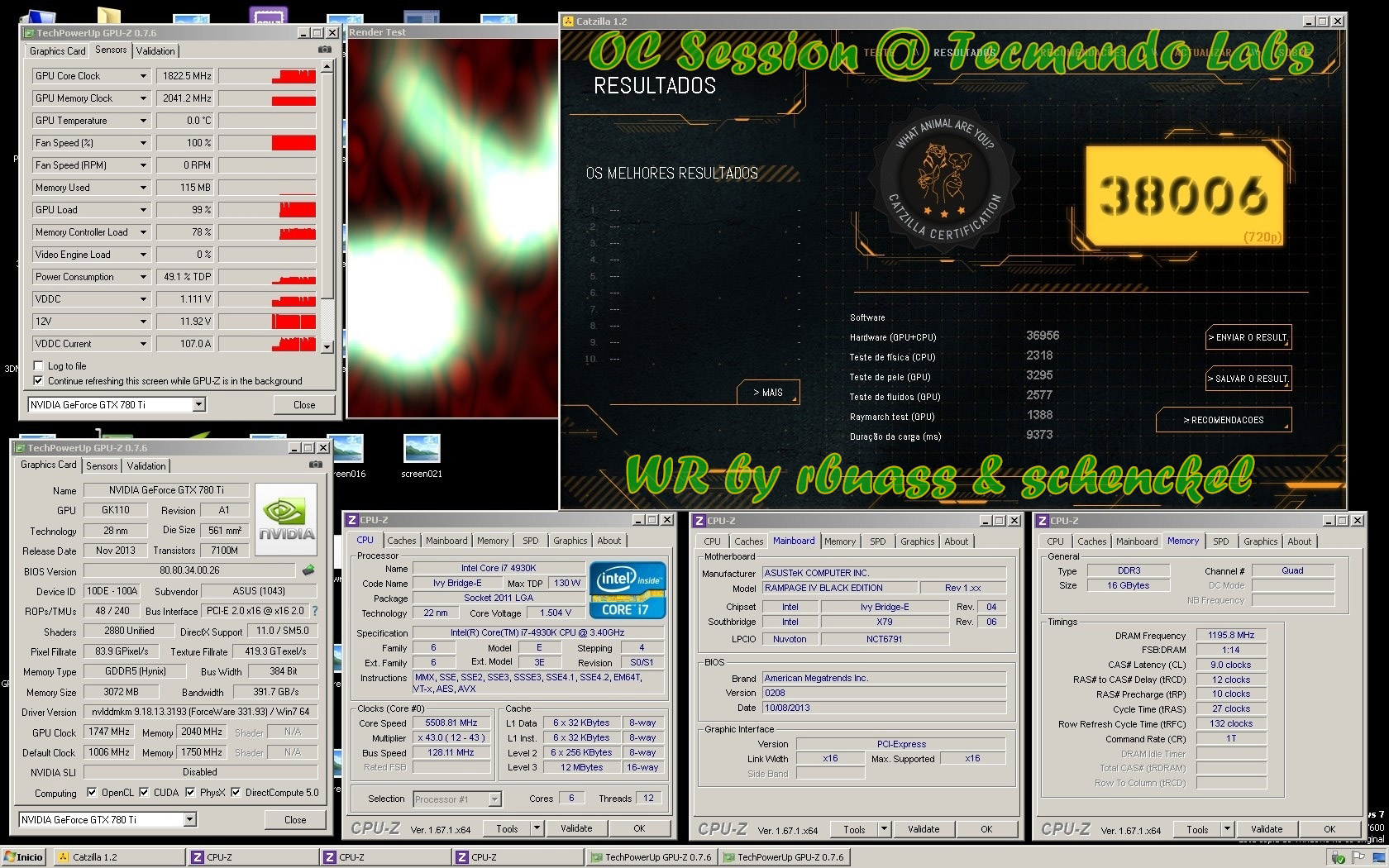 Фанат джиу-джитсу и экстремального оверклокинга бразилец Роналдо «Rbuass» Буассали при участии энтузиаста(-ов) TecMundo побил мировой рекорд в набирающем популярность бенчмарке Catzilla (режим 720p). С помощью жидкого азота он разогнал видеоадаптер Asus GeForce GTX 780 Ti DirectCU II OC до 1822,5/8164,8 МГц (ядро/память), а также процессор Intel Core i7-4930K с 3,4 ГГц до 5,5 ГГц, что позволило набрать 38006 очков в вышеупомянутом тесте.