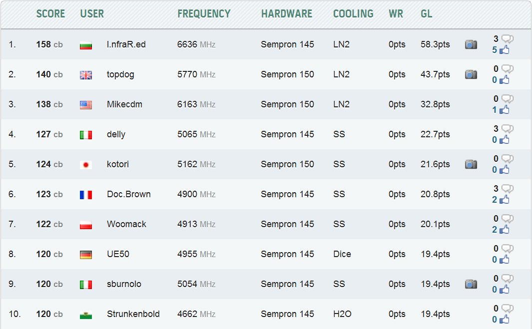 I.nfraR.ed из Болгарии. Его отборный Sempron 145 (2,8 ГГц) смог покорить частоту в 6636 МГц под жидким азотом и набрать