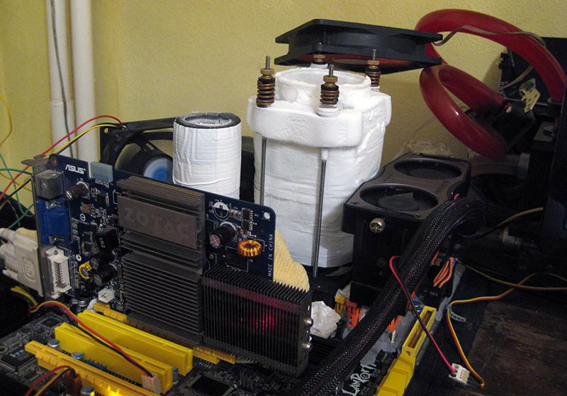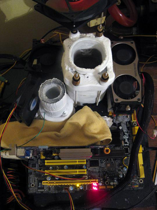 DFI, оперативную память Crucial Ballistix DDR2 (партия D9GKX), видеокарту Zotac GeForce 8500 GT DDR2 и испарители LN2 на процессоре и чипсете AMD 790FX.
