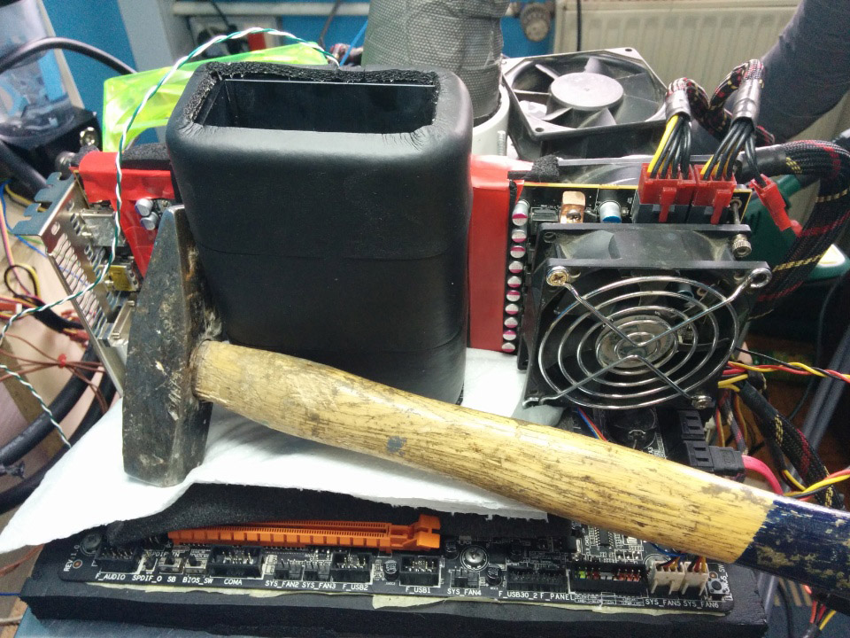 Для экспериментов также использовались: материнская плата Gigabyte GA-Z87X-OC Force, 4 ГБ модуль оперативной памяти DDR3 с эффективной частотой 2610 МГц, испаритель для жидкого азота под названием EK-SF3D Critical Point и термопаста Gelid GC-Extreme.