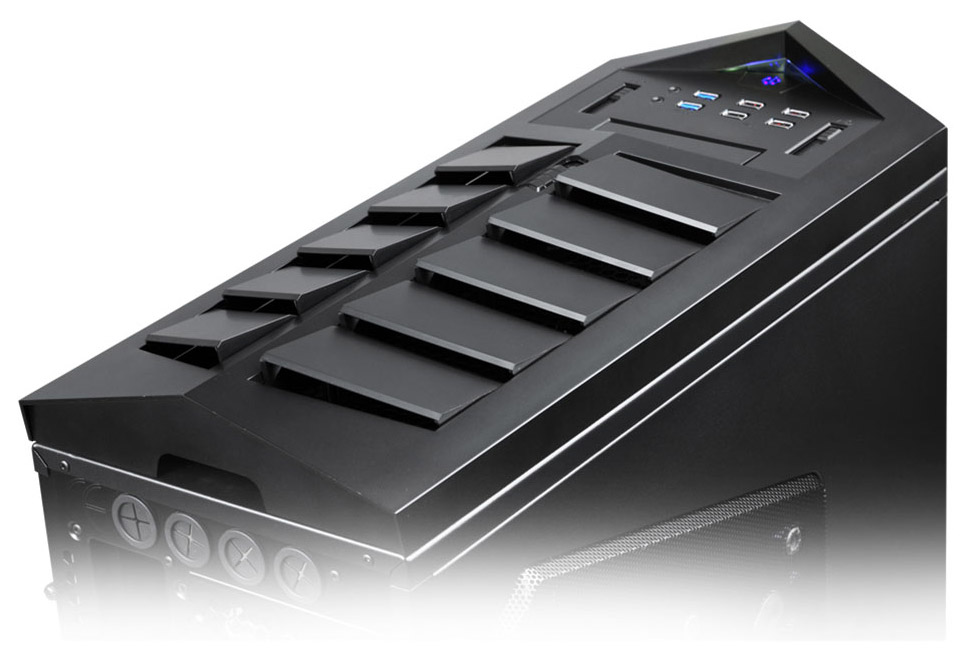 Дизайн шасси предусматривает наличие декоративной дверцы для 5,25-дюймовых отсеков, отверстий для укладки кабелей и подводки шлангов СВО. На сетчатой боковой панели могут разместиться до четырех вентиляторов. На панели ввода-вывода доступны два порта USB 3.0, четыре USB 2.0 и аудиоразъемы.