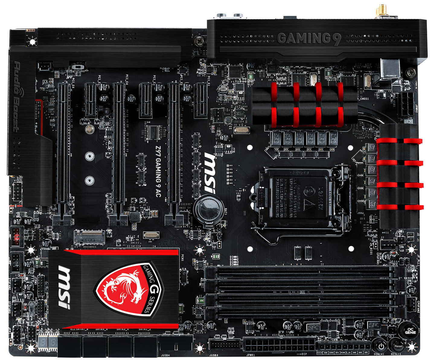 Новинка поддерживает актуальные процессоры Intel Haswell и Haswell Refresh, ну и наверняка подойдет для будущих CPU Devil's Canyon и Pentium Anniversary Edition, которые выйдут летом. Gaming 9 AC выделяется наличием высококачественного звука, усилителя для наушников, сетевого контроллера Qualcomm Atheros Killer E2205, адаптера Wi-Fi (802.11ac)/Bluetooth 4.0 с поддержкой WiDi, скоростного (до 10 Гбит/с) интерфейса M.2 и гнезд для измерения напряжений. Кроме того, имеется возможность построения графических конфигураций SLI и CrossFireX по формуле x8+x8 или x8+x4+x4 (только CrossFireX).