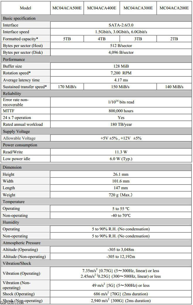 Накопители Toshiba MC Series имеют секторы емкостью 4 КБ и 6-гигабитный интерфейс передачи данных SATA. Заявленное энергопотребление дисков не превышает 11,6 Вт. Устройства весят максимум 720 г при габаритах 147 x 101,6 x 26,1 мм. Диапазон рабочих температур ограничен значениями 5 °C и 55 °C.