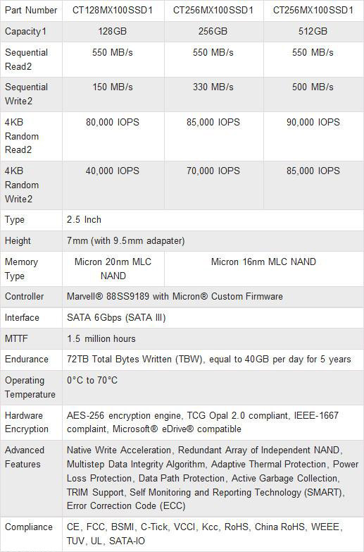 Поначалу Crucial (Micron) ограничится тремя 2,5" SSD серии MX100 объемом 128, 256 и 512 ГБ. Младшая модель CT128MX100SSD1 будет отличаться от собратьев применением 20-нм ячеек памяти, которые теоретически рассчитаны на большее количество циклов перезаписи, нежели 16-нм ячейки. В то же время производительность 128 ГБ накопителя будет не на высоте: скорости чтения/записи — до 550/150 МБ/с, количество IOPS — 80000/40000.