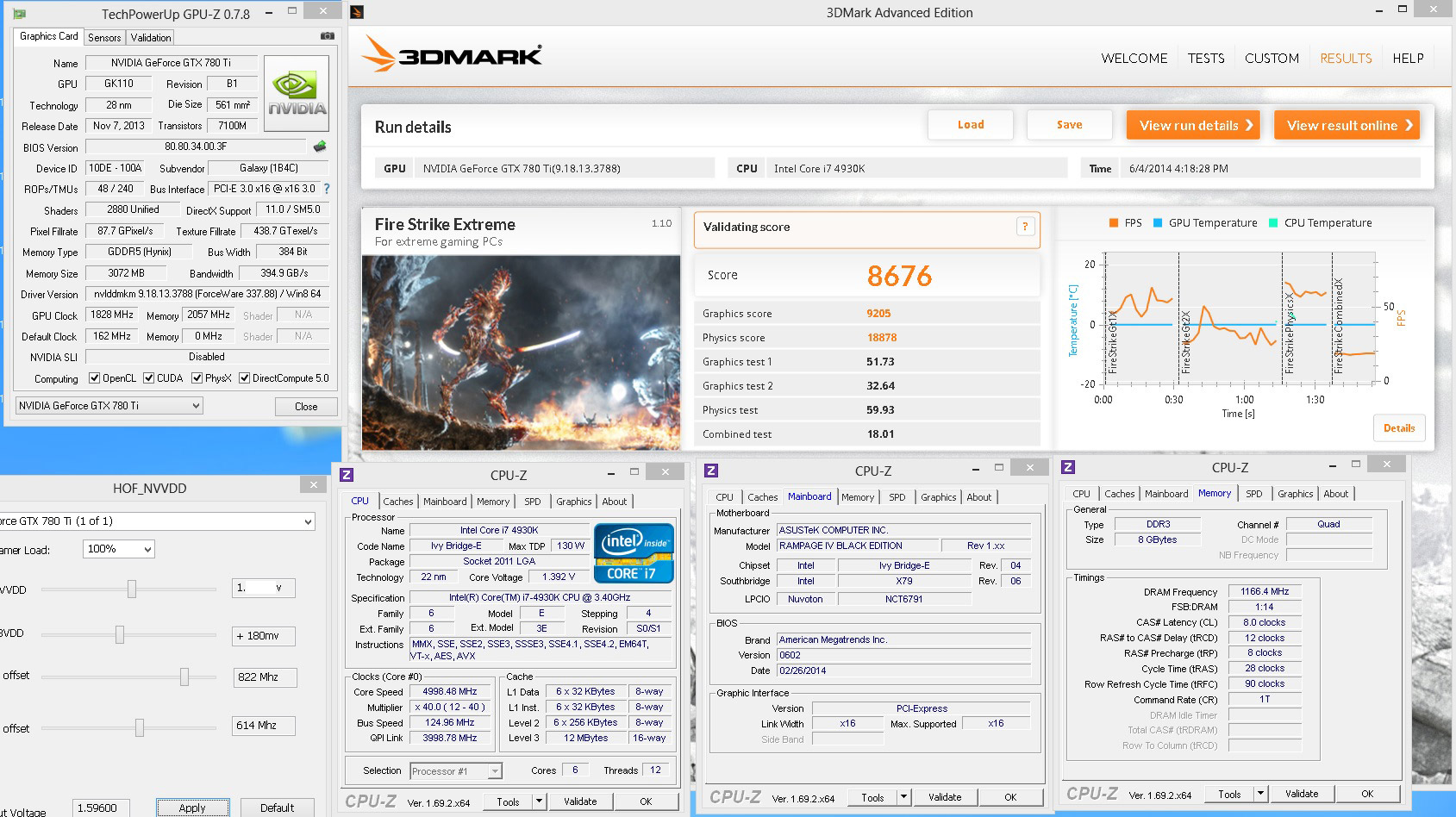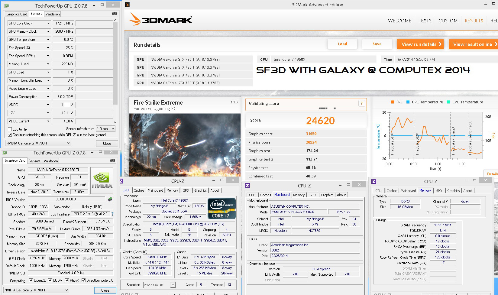Ключом к успеху стало использование видеокарт Galaxy GeForce GTX 780 Ti эксклюзивной серии Hall of Fame V20 (максимальный разгон одной из них составил 1900/8228 МГц), а также процессоров Intel Core i7-4960X (@5,5 ГГц) и Core i7-4930K (@5 ГГц). Естественно, не обошлось без испарителей для LN2 EK-SF3D Critical Point.