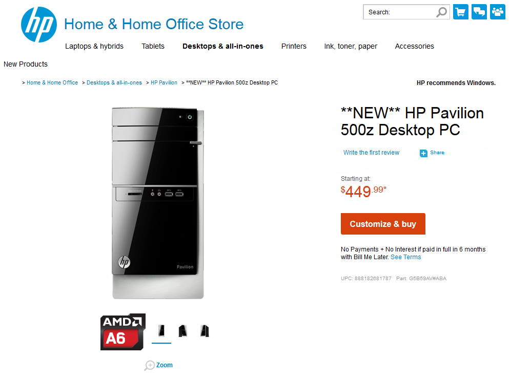 В базовую конфигурацию компьютера HP Pavilion 500z, кроме процессора A6-7400K, также входят: 6 ГБ оперативной памяти DDR3-1600, жесткий диск объемом 1 ТБ (7200 об/мин), адаптер Wi-Fi (802.11 b/g/n)/Bluetooth 4.0, пишущий DVD-привод, картридер «7 в 1», 300-ваттный блок питания и другие компоненты.