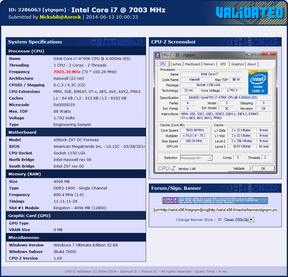 Возвращаясь к рекорду NickShih, отметим, что ему потребовалось повысить напряжение vCPU до 1,79 В, а множитель — до 70x. Два из четырех физических ядер инженерного семпла Core i7-4790K, а также технология Hyper-Threading, на время тестовой сессии отключались.