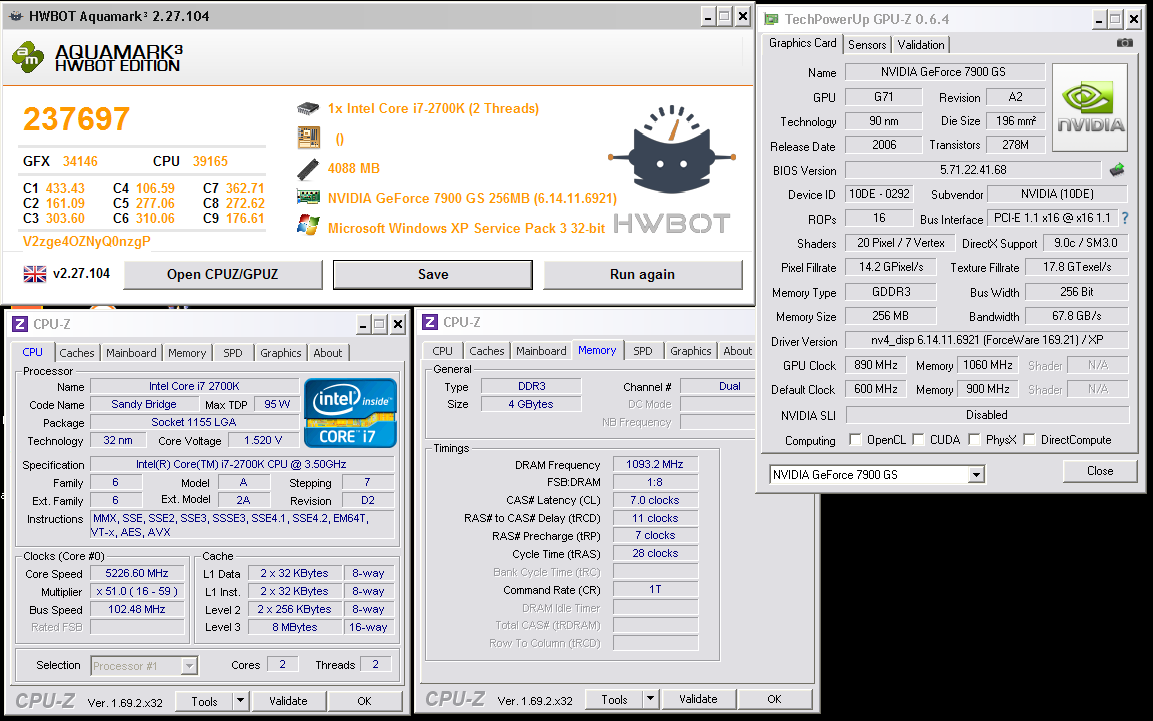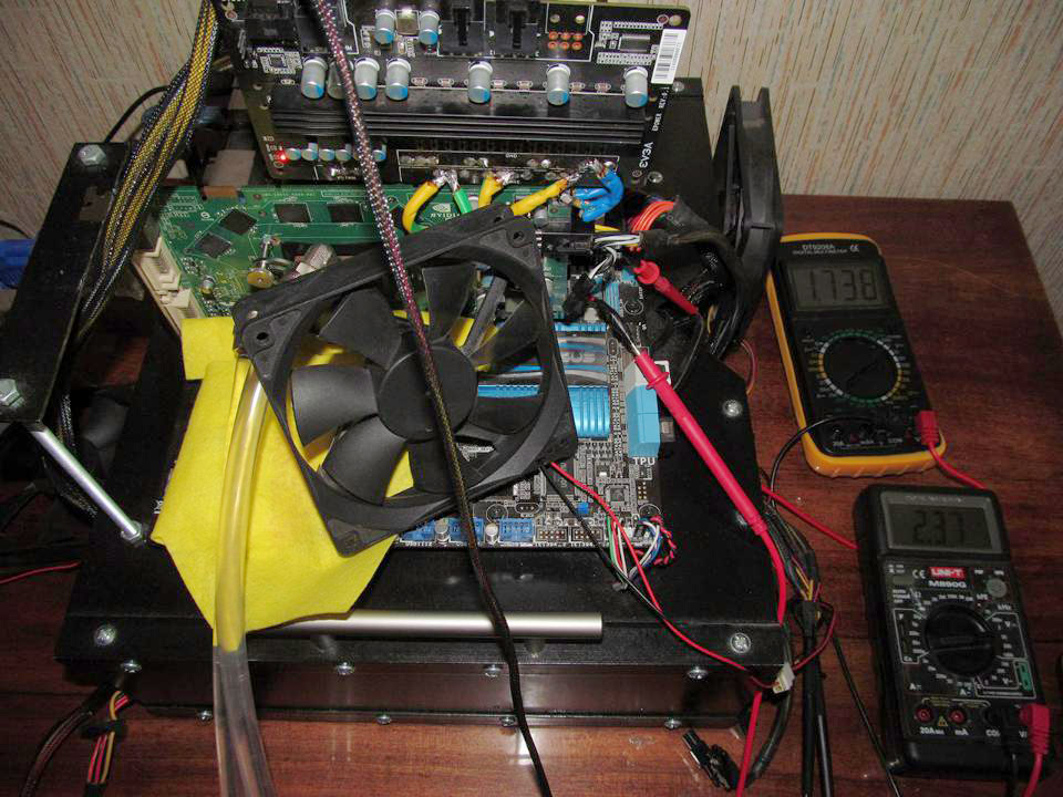 Судя по загруженным на hwbot.org снимкам, Vadimua снова задействовал плату EPower, позволившую подать больше мощности на ядро G71-N-A2. Для охлаждения чипа использовалась ледяная вода. Частоты видеоадаптера повышались с 600/1800 МГц до 890/2120 МГц, процессор Intel Core i7-2700K был разогнан с 3,5 до 5,2 ГГц, память работала в режиме DDR3-2186.