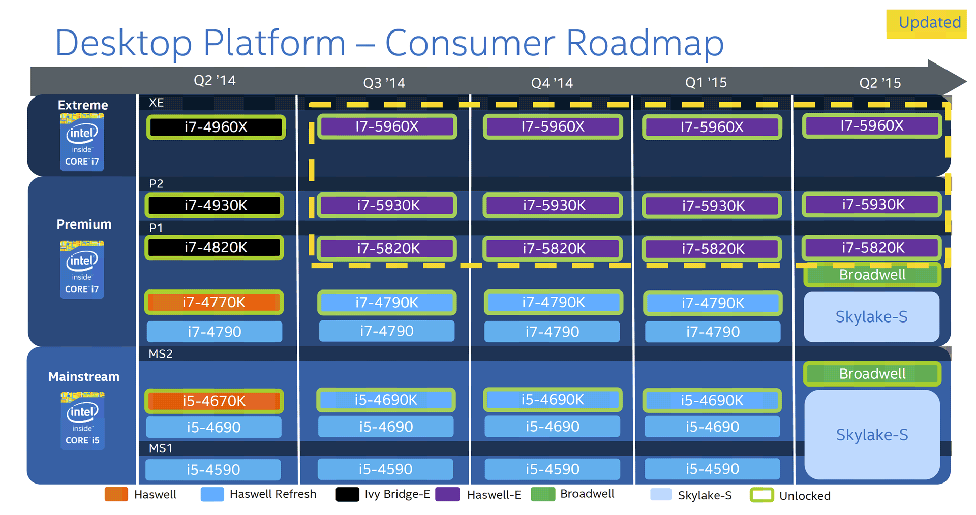 В опубликованной недавно схеме, отражавшей процессорные планы корпорации Intel на ближайшие 12 месяцев, было указано, что чипы Broadwell-K (14-нм) заменят оверклокерские CPU Core i7-4790K и Core i5-4690K в самом начале 2015 года. Однако, согласно свежей технологической дорожной карте, обнародованной сайтом VR-Zone, первые процессоры Broadwell выйдут не раньше Skylake (14-нм), то есть во втором квартале 2015 г. В означенном тандеме Broadwell будет отведена роль CPU для энтузиастов разгона, а Skylake обойдутся без свободного множителя, но зато получат поддержку памяти DDR4 и будут совместимы с новой платформой Intel LGA1151.