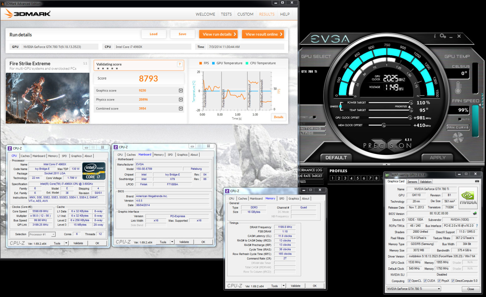 K|ngp|n и TiN использовали шестиядерный процессор Intel Core i7-4960X с относительно небольшим разгоном до 5,6 ГГц, материнскую плату EVGA X79 Dark, видеокарту EVGA GeForce GTX 780 Ti Classified K|ngp|n Edition (1072/7000@2025/7820 МГц), и 16 ГБ (четыре планки по 4 ГБ) оперативной памяти DDR3 с эффективной частотой 2400 МГц.