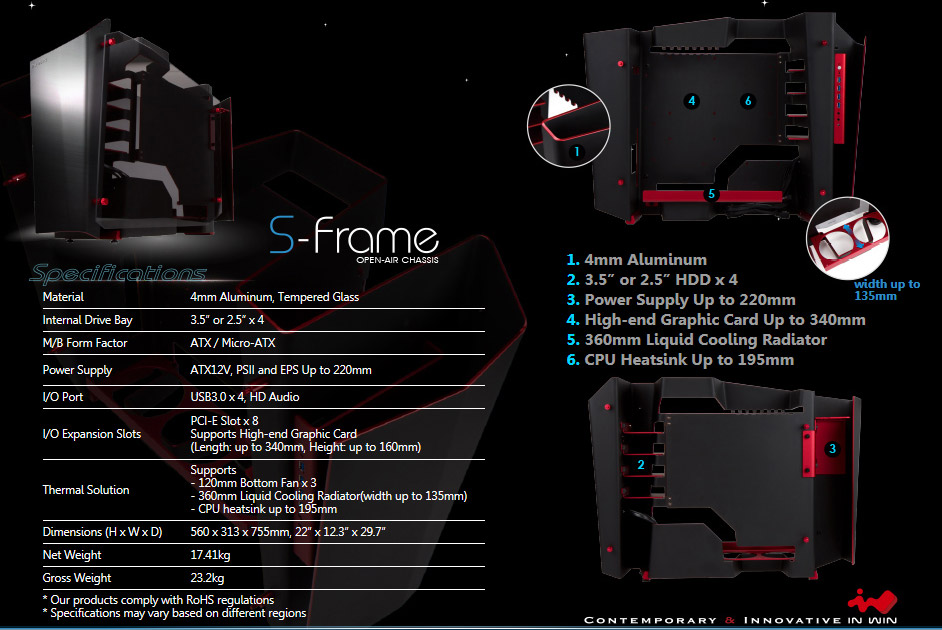 In-Win S-Frame изготовлен из алюминия толщиной 4 мм и закаленного стекла. Габариты конструкции составляют 755 x 313 x 560 мм, масса — 17,41 кг.