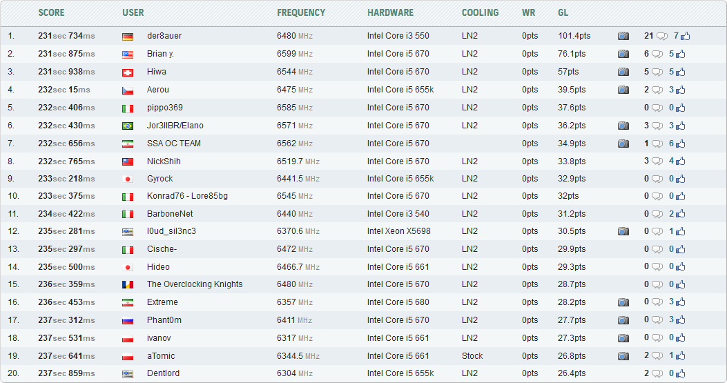 Энтузиаст экстремального разгона из Германии Роман «Der8auer» Хартунг установил рекорд в дисциплине HWBot wPrime 1024m для двухъядерных CPU, использовав для этого относительно скромный 3,2 ГГц процессор Intel Core i3-550 (Clarkdale). При этом Der8auer обошел всех тех, кто состязался за первенство в wPrime 1024m, имея на руках отборные семплы Core i5-670 и Core i5-655K.