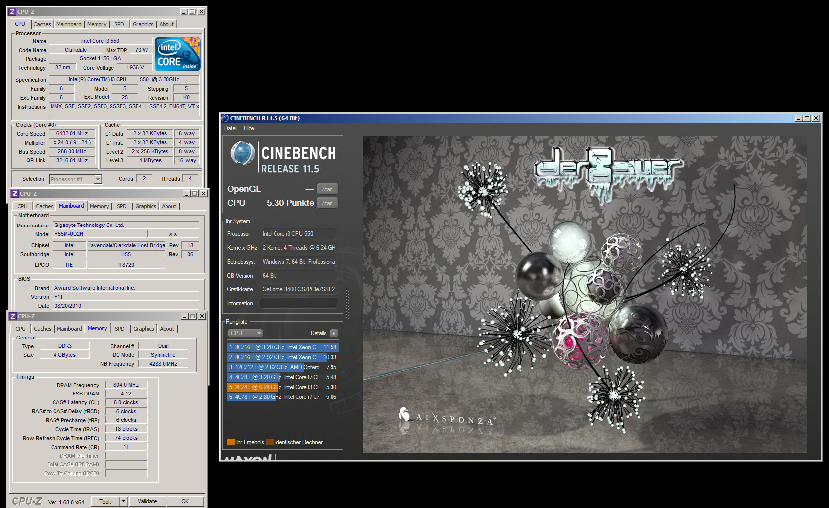 Кроме wPrime 1024m, система была испытана еще в нескольких бенчмарках, в том числе в Cinebench R11.5, где Der8auer занял седьмое место в общем зачете и второе среди Core i3-550. Его результат — 5,3 балла.