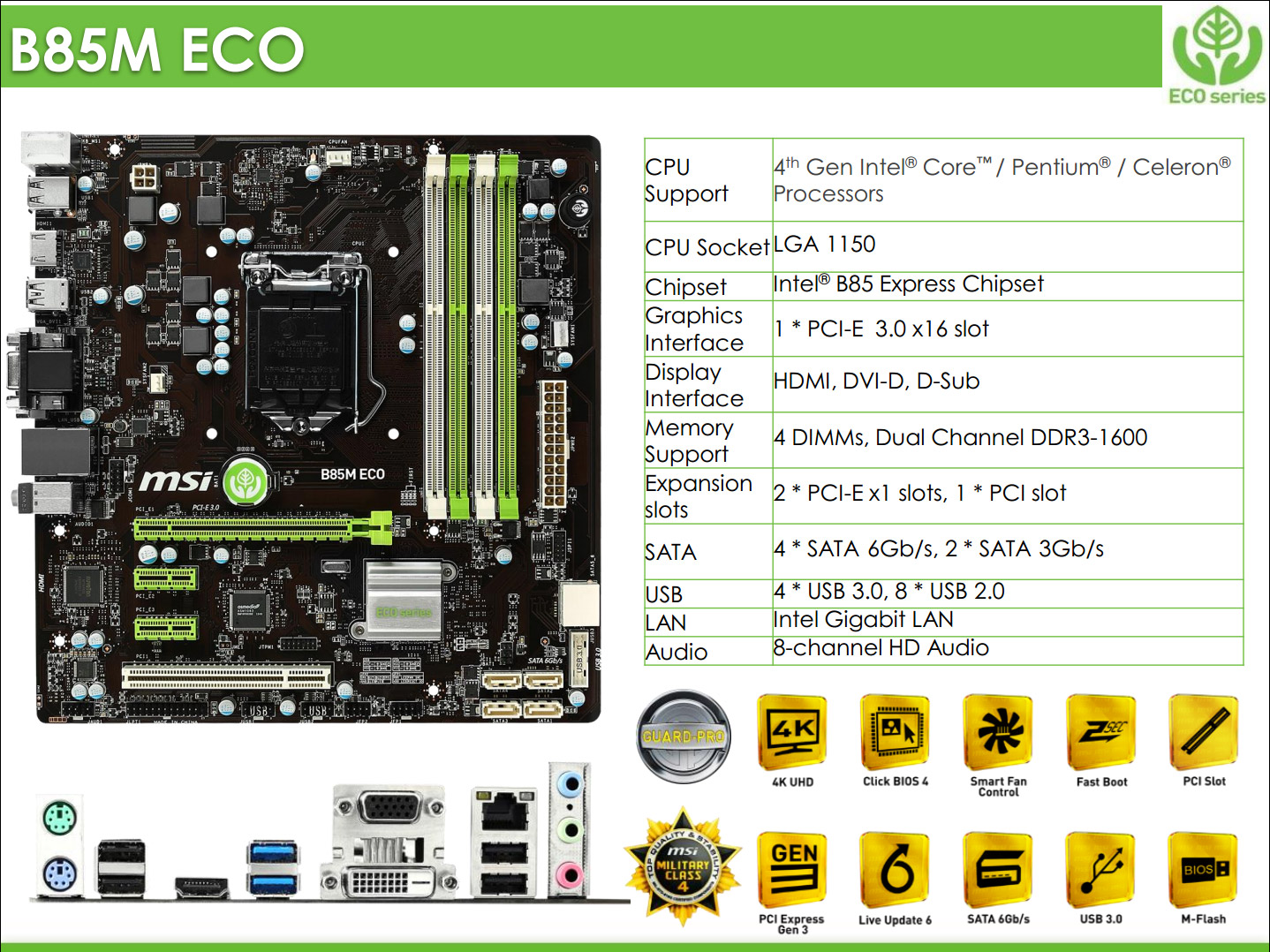 Общим для дуэта MSI B85M Eco/H81M Eco является наличие трех фаз питания процессорного гнезда LGA1150, разъемов PCI Express x16, PCI-E x1 (2 ед.) и PCI для карт расширения, двух портов SATA 3 Гбит/с, четырех каналов USB 3.0, интерфейсов вывода изображения HDMI, D-Sub и DVI. Модель B85M Eco имеет вдвое большее количество слотов DIMM DDR3 и SATA 6 Гбит/с — по четыре разъема. Также на ней находится кнопка Eco, автоматически отключающая неиспользуемые разъемы.