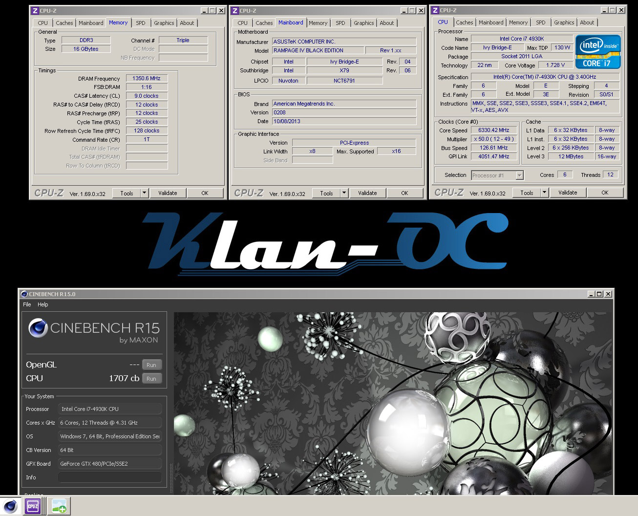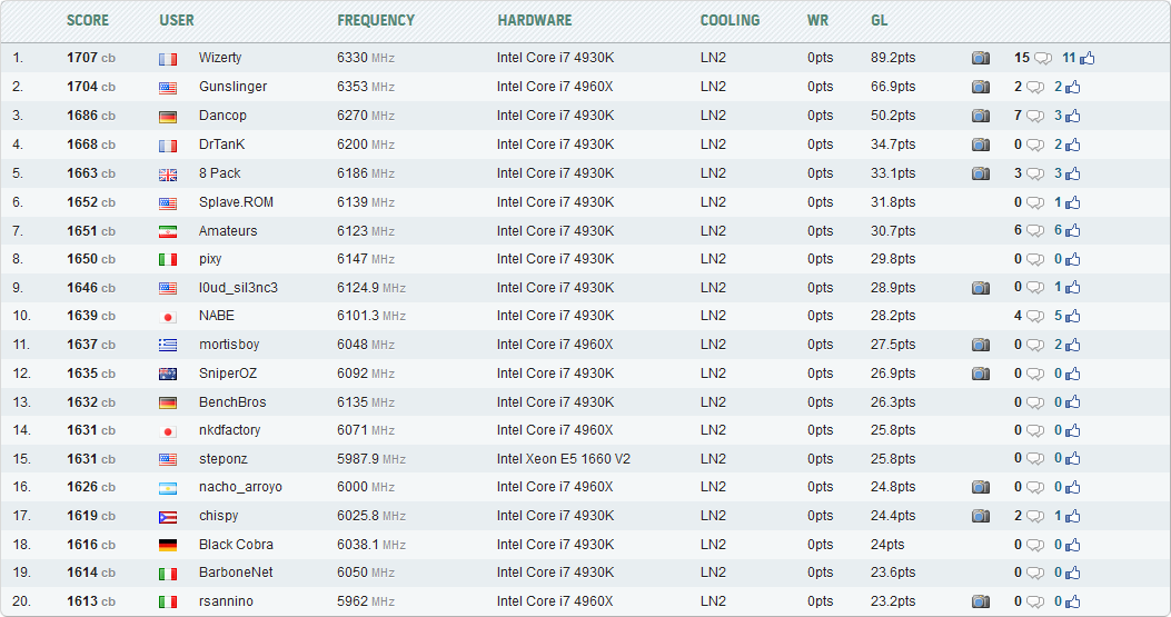 Wizerty набрал 1707 очков в Cinebench R15, использовав Core i7-4930K с разгоном до 6,33 ГГц
