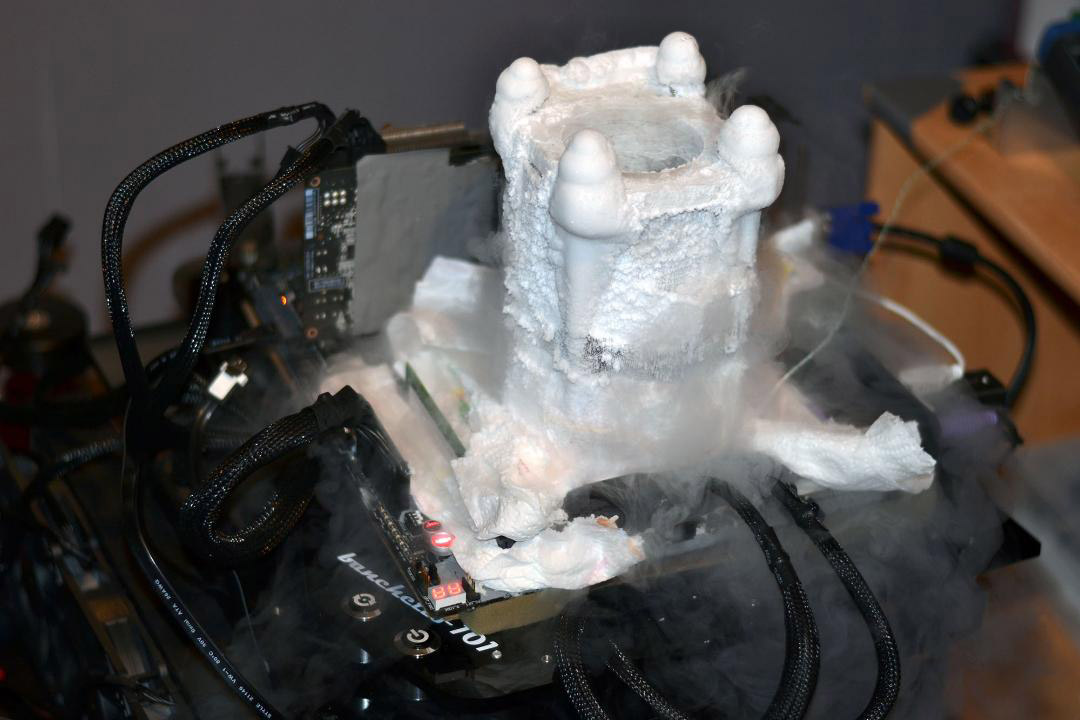 Кроме вышеуказанных компонентов, в составе тестовой системы были задействованы четыре 4 ГБ модуля оперативной памяти Kingston HyperX с эффективной частотой 2701 МГц и таймингами 9-12-12-25, блок питания Corsair Professional Series Gold 1200W и испаритель для жидкого азота на CPU.