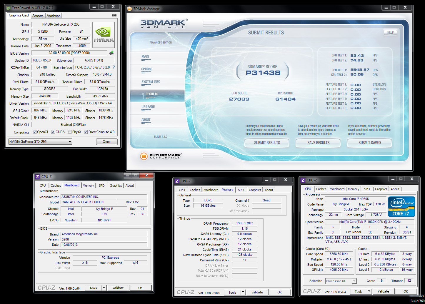 Разгон графических процессоров Nvidia GT200 достиг отметки 807 МГц (+40% к рекомендованному значению), частота шейдерного домена была повышена до 1838 МГц (+48%), эффективная частота памяти была увеличена до 2498 МГц (+25%). Пару «старичку» GTX 295 составил шестиядерный процессор Intel Core i7-4930K (@5758 МГц, 1,73 В), установленный в материнскую плату Asus Rampage IV Black Edition на чипсете Intel X79. Задействованная в системе оперативная память Corsair Vengeance Pro работала в режиме DDR3-2730 с таймингами 9-12-12-21.