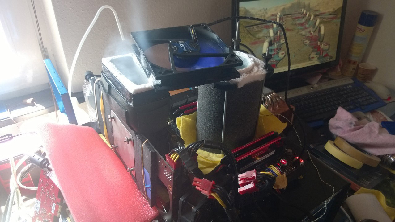 Немецкий энтузиаст Роман «Der8auer» Хартунг выделил несколько часов свободного времени для азотных экспериментов над двухчиповой видеокартой GeForce GTX 295 первой ревизии. Данное устройство, напомним, выполнено на двух платах, между которыми имеется зазор для системы охлаждения. Предсказуемо, заоблачных высот карта не достигла, но показала лучший результат среди собратьев в тесте 3DMark Vantage — 31438 очков (предустановка Performance).