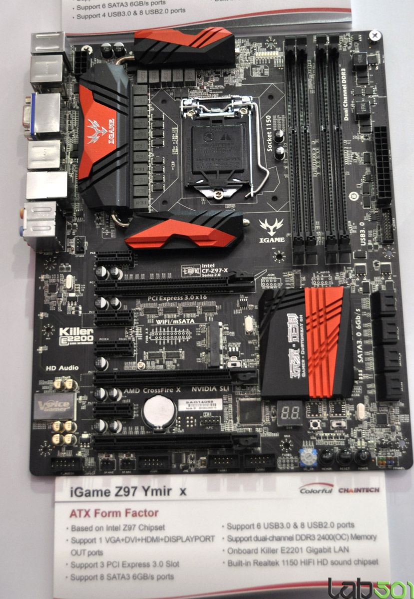 Colorful iGame Z97 Ymir-X использует традиционную для видеокарт той же марки черно-красную расцветку. Плата имеет 16-канальную подсистему питания сокета LGA1150, четыре слота для оперативной памяти DDR3-2400, разъемы PCI-E 3.0 x16, PCI-E 3.0 x16@x8, PCI-E 2.0 x16@x4, PCI-E 2.0 x1 (4 ед.) и mSATA для карт расширения, восемь портов SATA 6 Гбит/с, гигабитный сетевой контроллер Qualcomm Atheros Killer E2201, 7.1-канальный аудиокодек Realtek ALC1150, четыре порта USB 3.0, видеовыходы DisplayPort, HDMI, DVI и D-Sub.