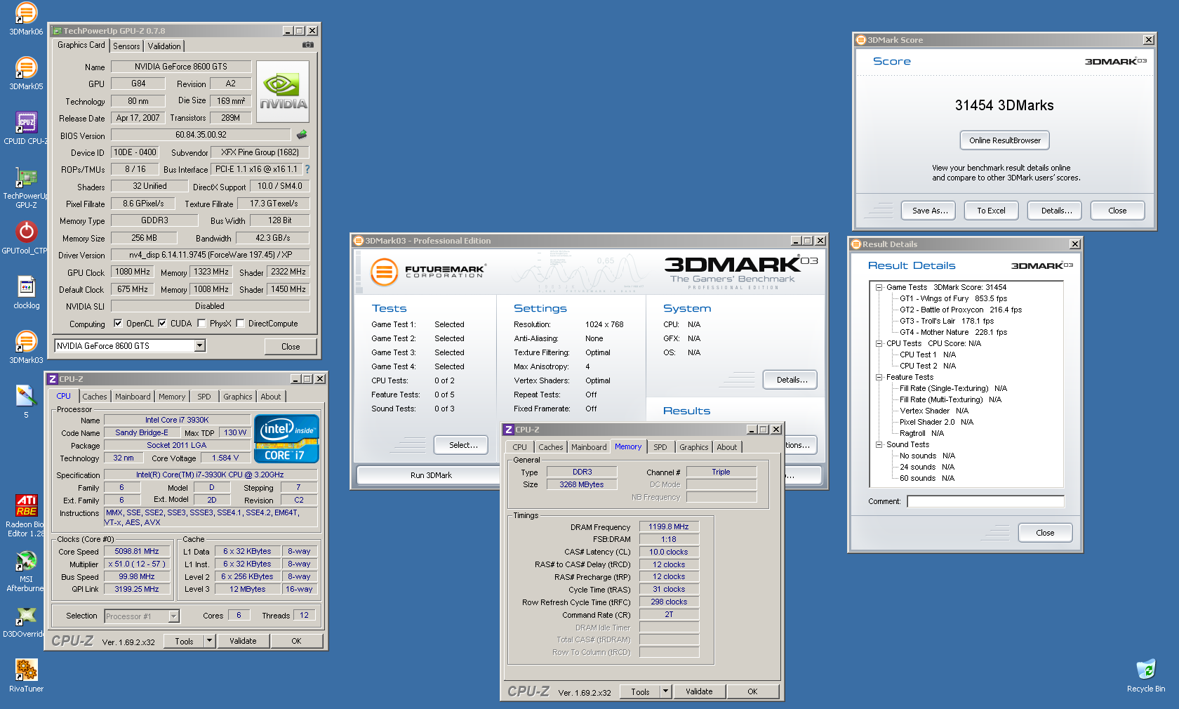 В составе бенч-стенда были задействованы: шестиядерный процессор Intel Core i7-3930K (@5,1 ГГц, 1,58 В), три 1 ГБ модуля оперативной памяти DDR3 @2400 МГц и вышеупомянутая видеокарта GeForce 8600 GTS с разгоном до 1080/2322/2646 МГц (ядро/шейдерный домен/память).